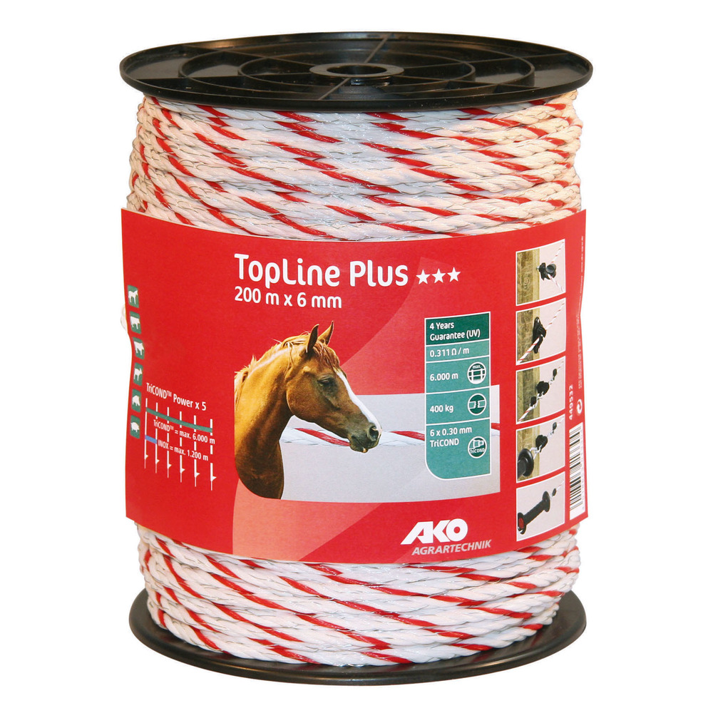 AKO TopLine PLUS garantiert hervorragende Leitfähigkeit und sehr lange Haltbarkeit bei mittleren bis langen Zaunanlagen. Im Vergleich zu nicht rostenden Drähten gleicher Stärke besitzen Bänder, Litzen und Seile der TopLine PLUS Linie, durch Verwendung unseres neuen Leitermaterials TriCOND, eine 5 x höhere Leitfähigkeit, d.h. mit TriCOND können Sie 5 x längere Zäune betreiben bzw. transportieren 5 x mehr Strom zum Ort der Tierberührung = 5 x mehr Sicherheit4 Jahre Garantie auf UV-Stabilität!Farbe: weiß/rot