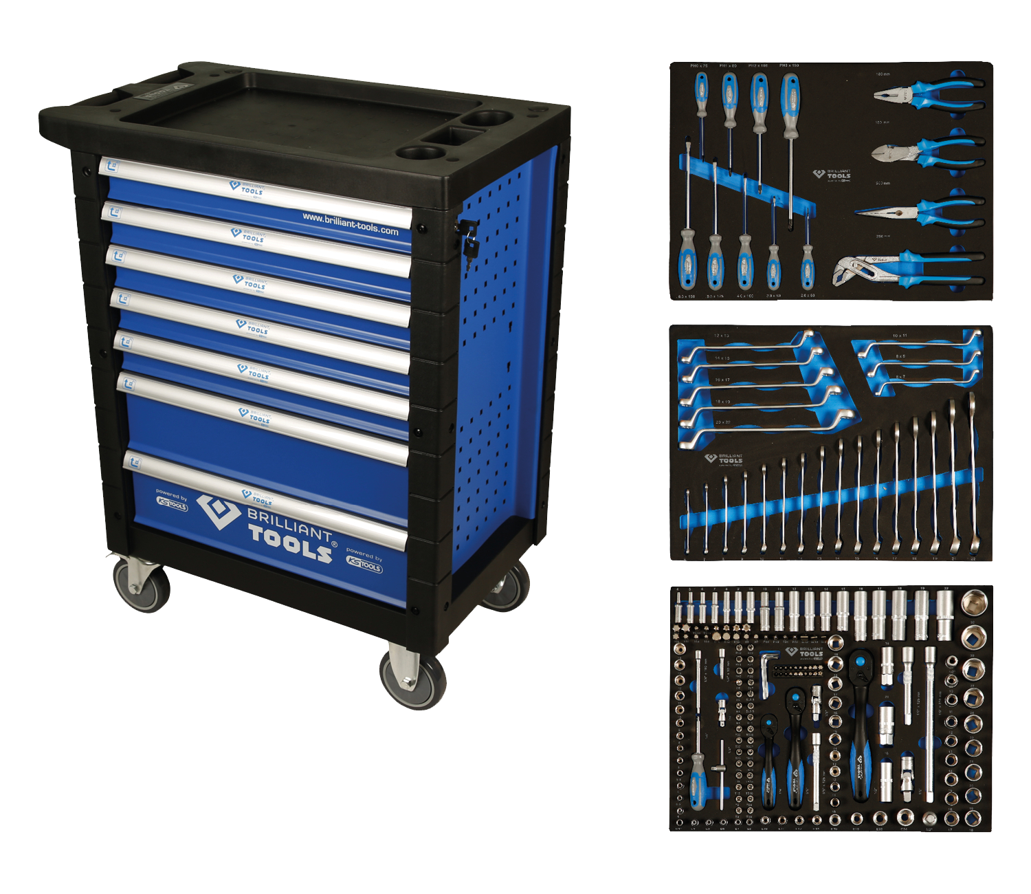 Der Werkstattwagen wird komplett vormontiert und mit drei bestückten Schubladen ausgeliefert. Auspacken – fertig! Damit ist er sofort einsatzbereit.Mithilfe der ergonomischen in die Kunststoffablage integrierten Schiebegriffe lässt er sich ziemlich leicht durch die Werkstatt manövrieren und dabei schützt der Kantenschutz an den Ecken bei Kollisionen.Dank seiner 2 Feststellbremsen an den Lenkrollen bleibt er sicher am Zielort stehen.Der Profi Werkstattwagen ist hochwertig pulverbeschichtet und hat sieben Schubladen. Zwei Schubladen sind besonders hoch und bieten somit auch für Bohrmaschinen und anderen großen Werkzeugen ausreichend Platz. Durch die seitliche Schlüssellochung kann mit den richtigen Halterungen zusätzlicher Stauraum geschaffen werden.Alle Schubladen sind kugelgelagert und auch bei voller Beladung von 35 kg maximale 100% ausziehbar.Damit Ihr Profi Werkstattwagen nicht umkippt sind alle Schubladen einzeln verriegelt und können noch durch das Zentralschloss gesichert werden..Der Profi Werkstattwagen im Detail:Gesamtmaße: B 77 x H 97,5 x T 47 cmSchubladeninnenmaß: 5x 52,8 cm x 39,8 cm x 55 mm2x 52,8 x 39,8 x 13,5 cmGesamttragkraft: 400 kgBelastbarkeit je Schublade: 35 kgVollauszug: JaKugelgelagert: JaVerriegelung: Einzel, Zentral abschließbar: seitlich, 2 SchlüsselKantenschutz: KunststoffRollen: 2 Lenkrollen, 2 BockrollenSchublade 1:Steckschlüssel, 170-teilig:mit 6,3 mm (1/4 Zoll) Antrieb:-je 1 Sechskant-Stecknuss 4, 4.5, 5, 5.5, 6, 7, 8, 9, 10, 11, 12, 13, 14 mm-je 1 Sechskant-Stecknuss, extra lang 4, 5, 6, 7, 8, 9, 10 mm-je 1 Torx-E-Stecknuss E4, E5, E6, E7, E8-je 1 Bit-Stecknuss, T-Profil T8, T9, T10, T15, T20, T25, T27, T30-je 1 Bit-Stecknuss, T-Profil mit Stirnlochbohrung TB8, TB9, TB10, TB15, TB20, TB25, TB27, TB30-je 1 Bit-Stecknuss, Pozidriv PZ0, PZ1, PZ2-je 1 Bit-Stecknuss, Innensechskant 3, 4, 5, 6 mm-je 1 Bit-Stecknuss, Schlitz 4, 5.5, 6.5, 7 mm-je 1 Bit-Stecknuss, Kreuz PH0, PH1, PH2-je 1 Verlängerung in 50 und 10 cm-1 Kardangelenk-1 Drehgriff 15 cm-1 1/4 Zoll-Umschaltknarre 14,5 cm, 72 Zähne feinverzahnt-1 Gleitgriff 11 cmmit 10 mm (3/8 Zoll) Antrieb:-je 1 Sechskant-Stecknuss 10, 11, 12, 13, 14, 15, 16, 17, 18, 19 mm-je 1 Sechskant-Stecknuss, extra lang 10, 11, 12, 13, 14, 15 mm-je 1 Torx-E-Stecknuss E10, E11, E12, E14, E16, E18-1 Verlängerung 12,5 cm-1 3/8“-Umschaltknarre 20,5 cm, 72 Zähne feinverzahnt-1 Zündkerzen-Stecknuss 18 mm-1 Adapter für 8 mm Bits-1 Kardangelenkmit 12,5 mm (1/2 Zoll) Antrieb:-je 1 Sechskant-Stecknuss 10, 11, 12, 13, 14, 15, 16, 17, 18, 19, 20, 21, 22, 24, 27, 30, 32 mm-je 1 Sechskant-Stecknuss, extra lang 16, 17, 18, 19, 22 mm-je 1 Torx-E-Stecknuss E20, E24-je 1 Zündkerzen-Stecknuss 16, 21 mm-1 Drehgriff 25 cm-1 Verlängerung 12,5 cm-1 1/2 Zoll-Umschaltknarre 25 cm, 72 Zähne feinverzahnt-1 Kardangelenk-1 Adapter für 8 mm Bits-Bits in 8 mm Antrieb x 30 mm Länge:-je 1 Bit, Torx mit Stirnlochbohrung TB40, TB45, TB50, TB55, TB60, TB70-je 1 Bit, Torx T40, T45, T50, T55, T60, T70-je 1 Bit, Innensechskant 7, 8, 10, 12, 14 mm-je 1 Bit, Kreuz PH3, PH4-je 1 Bit, Schlitz 8, 10, 12 mm-je 1 Bit, Pozidriv PZ3, PZ4-je 1 Innensechskantschlüssel 1.27, 1.5, 2, 2.5, 3, 4, 5 mm-Bits in 6,3 mm (1/4 Zoll) Antrieb x 25 mm Länge:-je 1 Bit, Vielzahn M5, M6, M8-je 1 Bit, T-Profil T5, T6, T7-je 1 Bit, RIBE-Profil M5, M6, M7, M8, M9-je 1 Bit, Fünfstern TS10, 15, 20, 25, 27, 30, 40, 45-1 Bit, T-Profil mit Stirnlochbohrung TB7Schublade 2:Schraubenschlüssel, 24-teilig:-16 Ringmaulschlüssel: 6, 7, 8, 9, 10, 11, 12, 13, 14, 15, 16, 17, 18, 19, 21, 22 mm-8 Ringschlüssel gekröpft: 6x7, 8x9, 10x11, 12x13, 14x15, 16x17, 18x19, 20x22 mmSchublade 3:Zangen und Schraubendreher, 13-teilig:-5 Schraubendreher, Schlitz: 2,0x63 mm, 3,0x80 mm, 4,0x10 cm, 5,5x12,5 cm, 6,5x15 cm-3 Schraubendreher, Philips: PH0x75 mm, PH1x80 mm, PH2x10 cm, PH3x15 cm-1 Profi-Kombizange: 18 cm-1 Profi-Seitenschneider: 18 cm-1 Profi-Telefonzange, gerade: 20 cm-1 Profi-Wasserpumpenzange: 25 cm