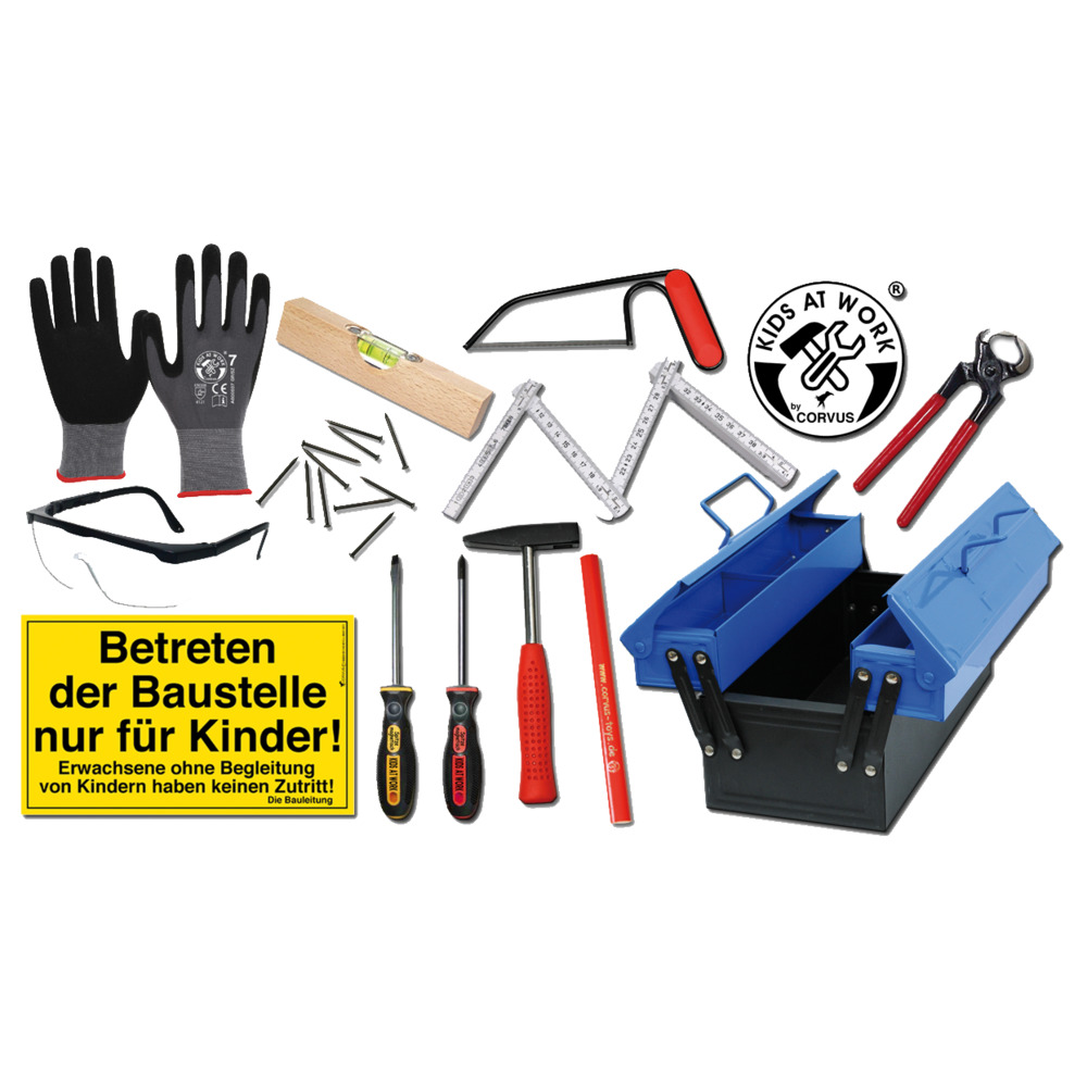 Ideales Ausstattungsset für den kleinen Handwerker! Werkzeugkoffer 12-teilig. Inhalt: Arbeitshandschuhe Strick, Zwickzange, Hammer, Schutzbrille, Handsäge, Holzwasserwaage, Meterstab, Bauschild, Zimmermannsbleistift, Schraubenzieher Normal+ Kreuzschlitz PH1 und Nägel 2,0 x 3,0 (100 Stück) Achtung: Inhalt kann vom Foto abweichen! Funktionstüchtiges Bastelwerkzeug! Bitte unter Aufsicht von Erwachsenen benutzen.