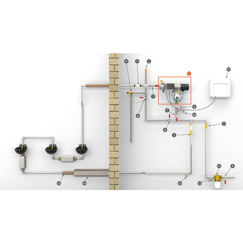 Es wird empfohlen ein durchströmtes Druckausgleichsgefäß in der Ringleitung im frostsicheren Bereich zu installieren (wird vom Fachinstallateur ausgelegt, nicht im Lieferumfang enthalten).Bei 3/4 Zoll Rohrleitungsdurchmesser sind bis zu 250 m Ringleitung möglich. Durchflussanzeige und Thermometer als optionales Zubehör erhältlich.