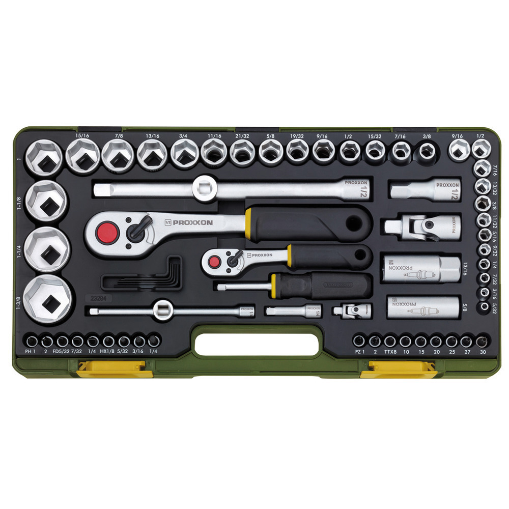 Professionelle Stecknusskassette mit komplettem Nusssortiment von 5/32″ - 1 3/8″. Mit dieser hochwertigen Werkzeugsatz habe Sie auf kleinsten Raum alle wichtigen Werkzeuge für das Arbeiten mit zölligen Schrauben die vielfach bei Englischen und Amerikanischen Maschinen / Geräte verwendet werden. Diese Stechnusskassette verfügt über eine handliche und doch stabile Einhand - Umschaltknarre für rasches und komfortables Arbeiten. Zusätzlich zu den Stecknüssen mit 1/2 und 1/4 Zoll Antrieb verfügt der Satz über ein umfangreiches Bit - Sortiment. Durch den kompakten und stabilen Kunststoffkoffer ist ein einfacher Transport oder eine saubere Lagerung dieses hochwertigen Werkzeugs kein Problem.