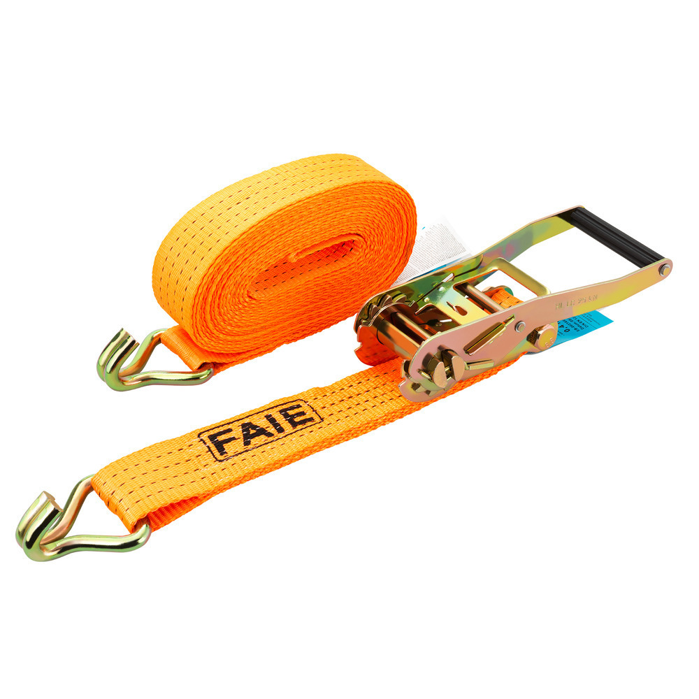 Mit Ratsche und mit 2 Rundhaken, 50 mm Breite, zul. Zugkraft 2000 daN (in Umreifung 4000 daN). Länge 15 m gesamt - Ideal für größere Anhänger z. B. Rundballentransport, usw.