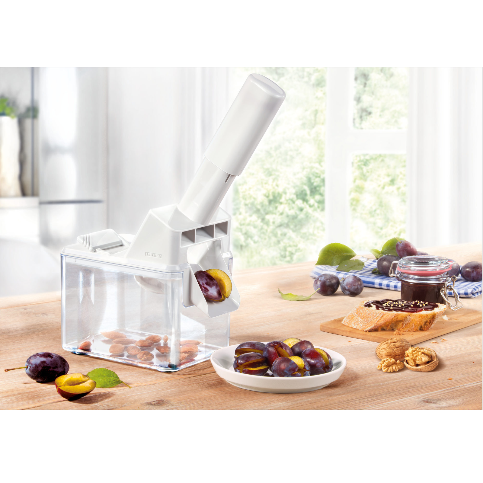 Kinderleicht Mirabellen, Pflaumen oder Zwetschken entkernen?Mit dem Entsteiner von Leifheit befreien Sie diese Früchte im Handumdrehen von ihrem Kern.Besonders praktisch: Der Pflaumenentkerner fächert das Fruchtfleisch gleichzeitig auf.So eignet sich das entkernte Obst perfekt als Dekoration für Kuchen oder Nachspeisen.Das scharfe Edelstahlmesser entfernt den Kern einfach und sauber von den Pflaumen.Das Fruchtfleisch fällt direkt in eine bereitgestellte Schüssel, während die Kerne in der Auffangschale gesammelt werden.Vier Gummifüße gewährleisten eine hohe Standfestigkeit.Um Mirabellen / Kriecherl zu entkernen, drehen Sie einfach den Stößel um.