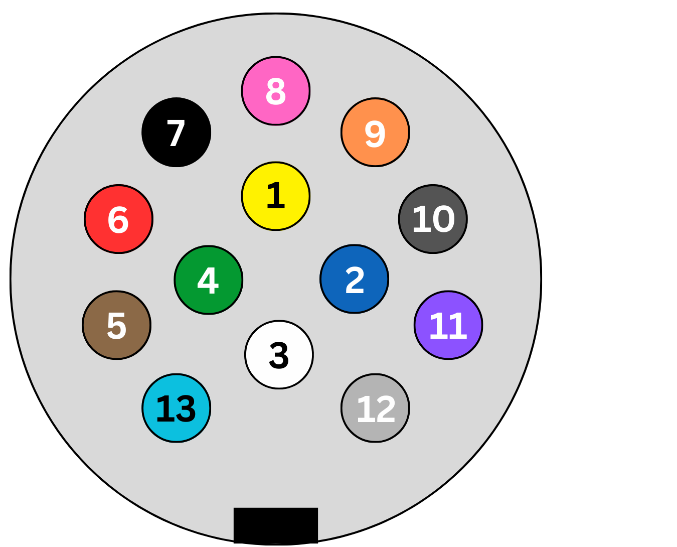 12hellgraureserviert für zukünftige AnwendungenMasseschleife als Kodierung für gekuppelten Anhänger, Verbindung von Kontakt 3 (Masse) mit 12 am Anhänger