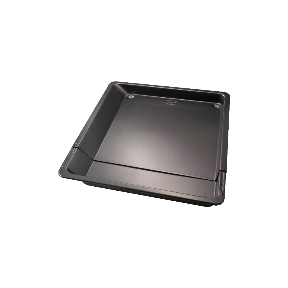 Practical adjustable stove baking tray made of sheet steel with a non-stick coating. Best baking results thanks to excellent heat conduction, easy to clean by hand, temperature resistant up to 230C, 5 year guarantee, Made in Germany, black. Infinitely adjustable from 33x37-52x3cm.