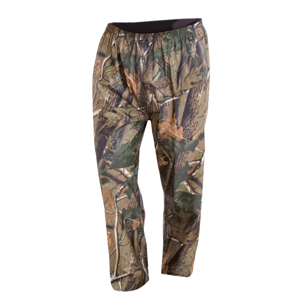 Camouflage set polyester/PVC. Welded seams. Jackets with front zip and adjustable hood. 2 pockets below. Pants with open pockets. Waistband with elastic band. Size M-XXL