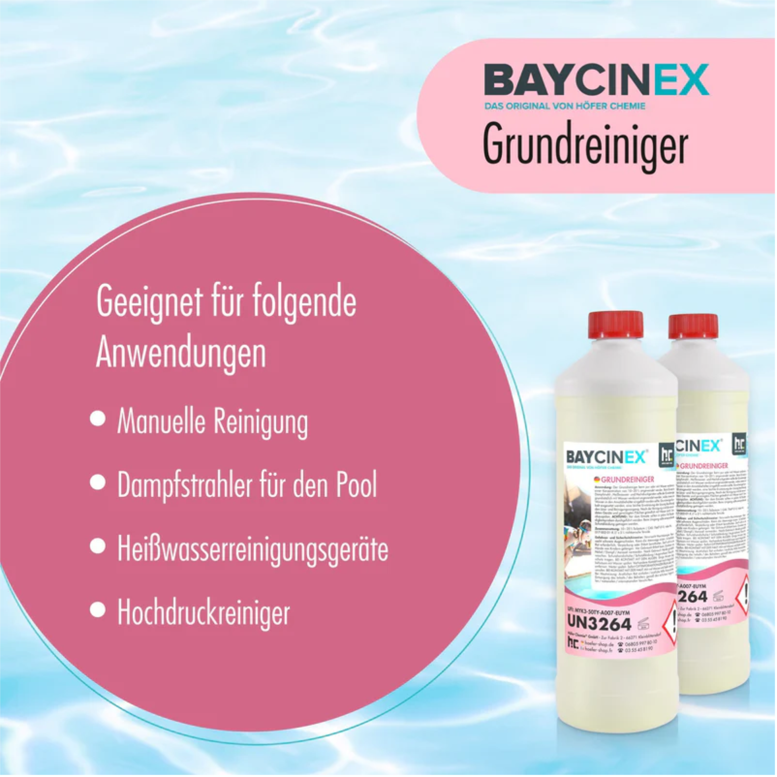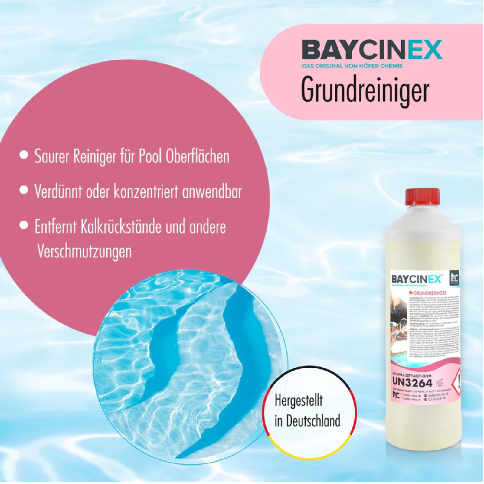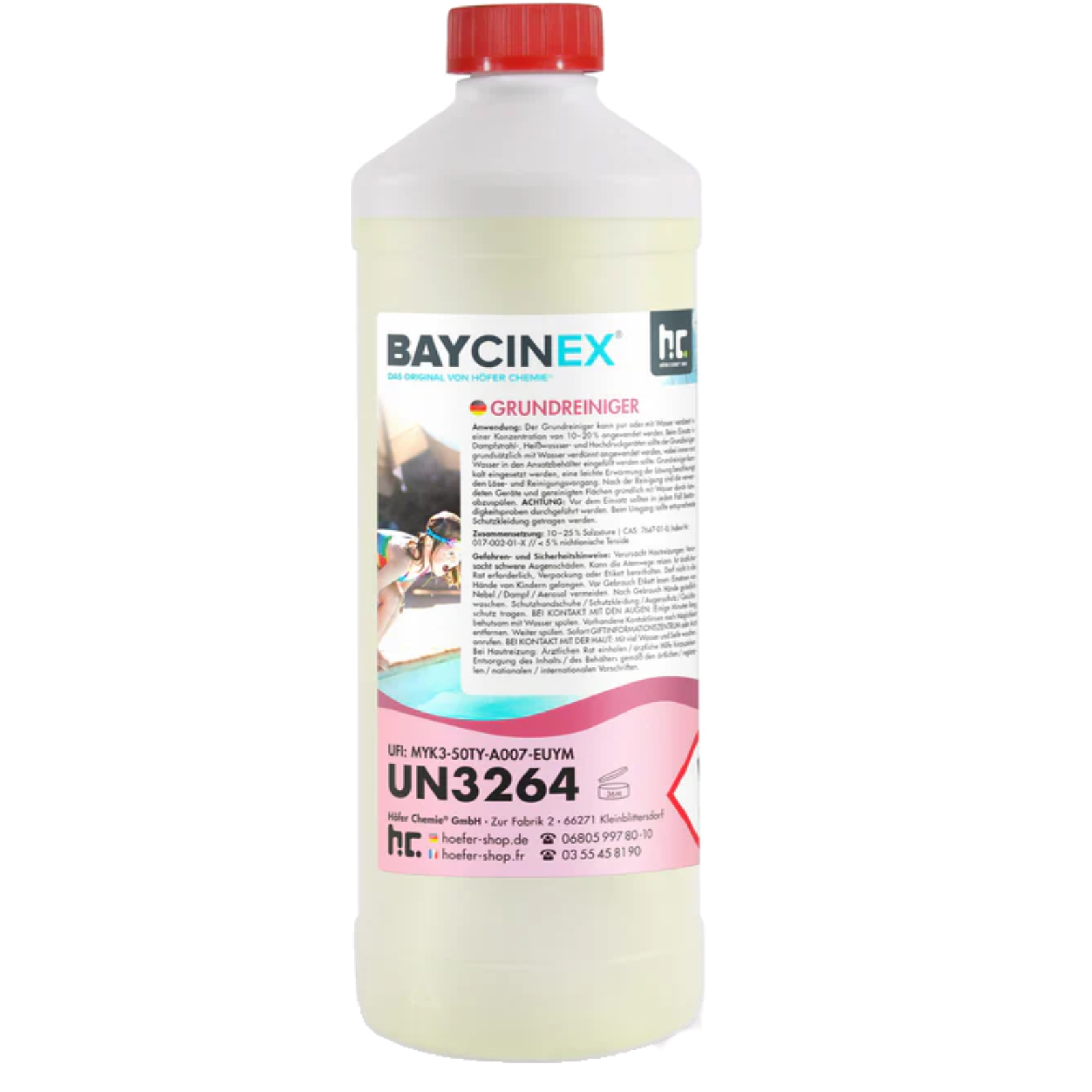 Even though BAYCINEX® pool cleaner from the Höfer Chemie online store has been specially produced to meet the requirements of professional pool floor cleaning, the acidic cleaning fluid can also be used in the pool tile area or for cleaning the pool edge. Be sure to take note of the favorable ordering options at Höfer Chemie! You can secure attractive discounts when you buy six 1-liter bottles of BAYCINEX® Pool Basic Cleaner online, and you can order the excellent pool cleaner in stock in a package of 15 bottles for even less.