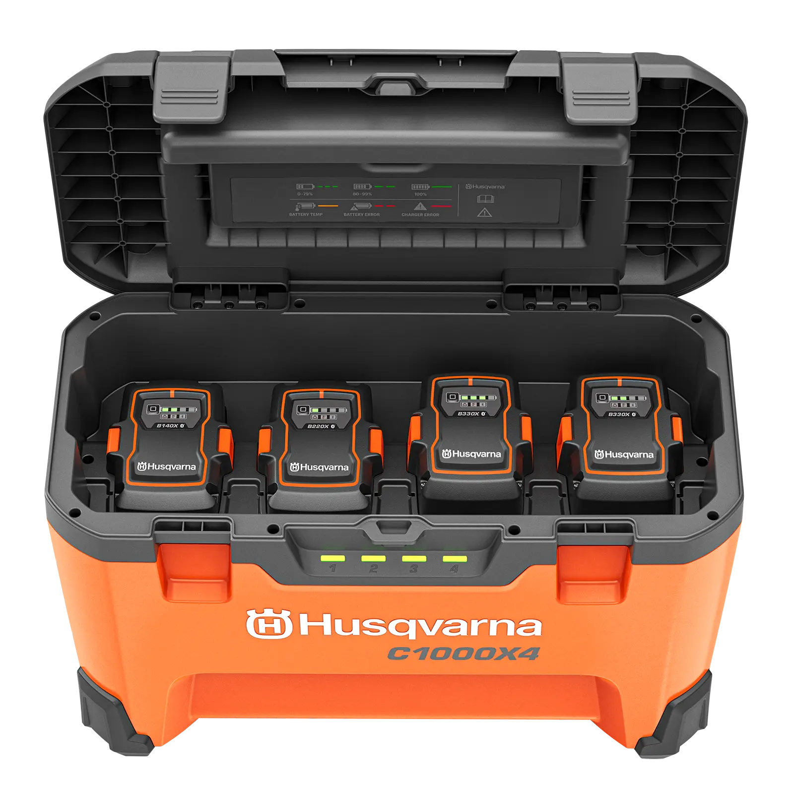 With the Husqvarna 40-C1000X4 Multi-Rack Charging Box, you can charge your BLi-X 36V batteries wherever you need them – in the workshop, on the go in your car, or directly on the construction site. Up to four batteries can be charged simultaneously and exceptionally quickly.
