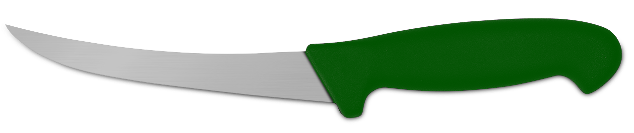 Handy short curved semi-flexible boning knife. ~