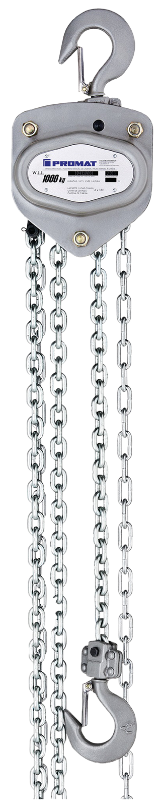 Closed sheet steel housing High-strength round steel chain With hanging hook and load hook Low overall height Low weight Roller and ball bearings on all rotating parts Automatically acting load pressure brake