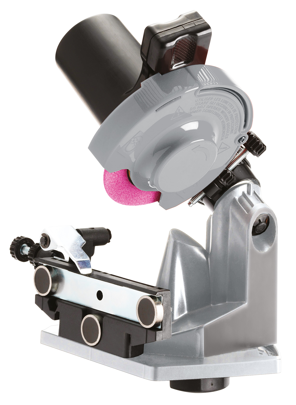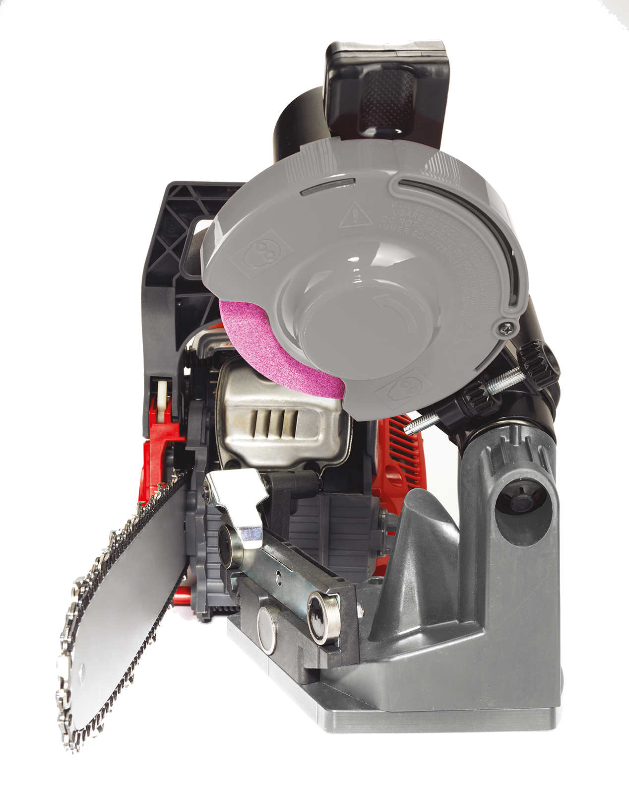 Lightweight battery-powered chain sharpener for sword mounting including battery and charger. ~