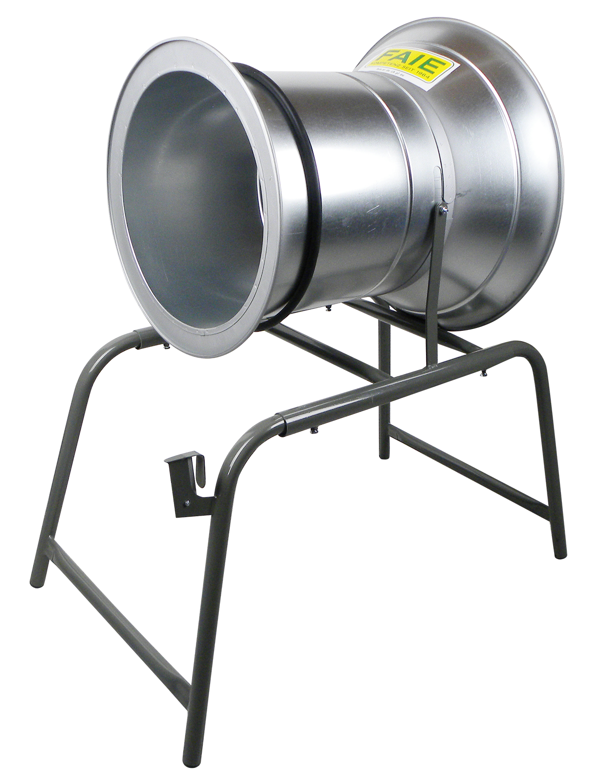 A robust packaging funnel with a practical metal frame. ~55 cm pipe diameter with feeding funnel made of galvanized sheet metal, ~pre-assembled ~with stable console, brake rubber and metal scraper ring (removable). ~