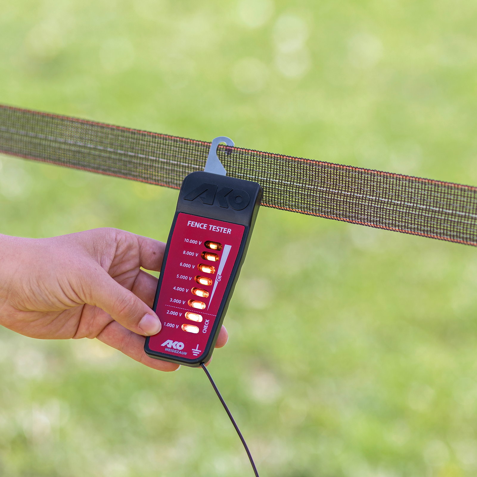 The voltage tester is an important and time-saving aid when operating electric fence systems. Handling: The instrument is hooked into the fence wire using the hook and the brass tip is pressed lightly into the ground. The built-in electronics mimic the animal contact condition. When the various control lamps light up, you can determine the voltage (impact strength) precisely and thus check whether the fence is safe at any point on the fence.