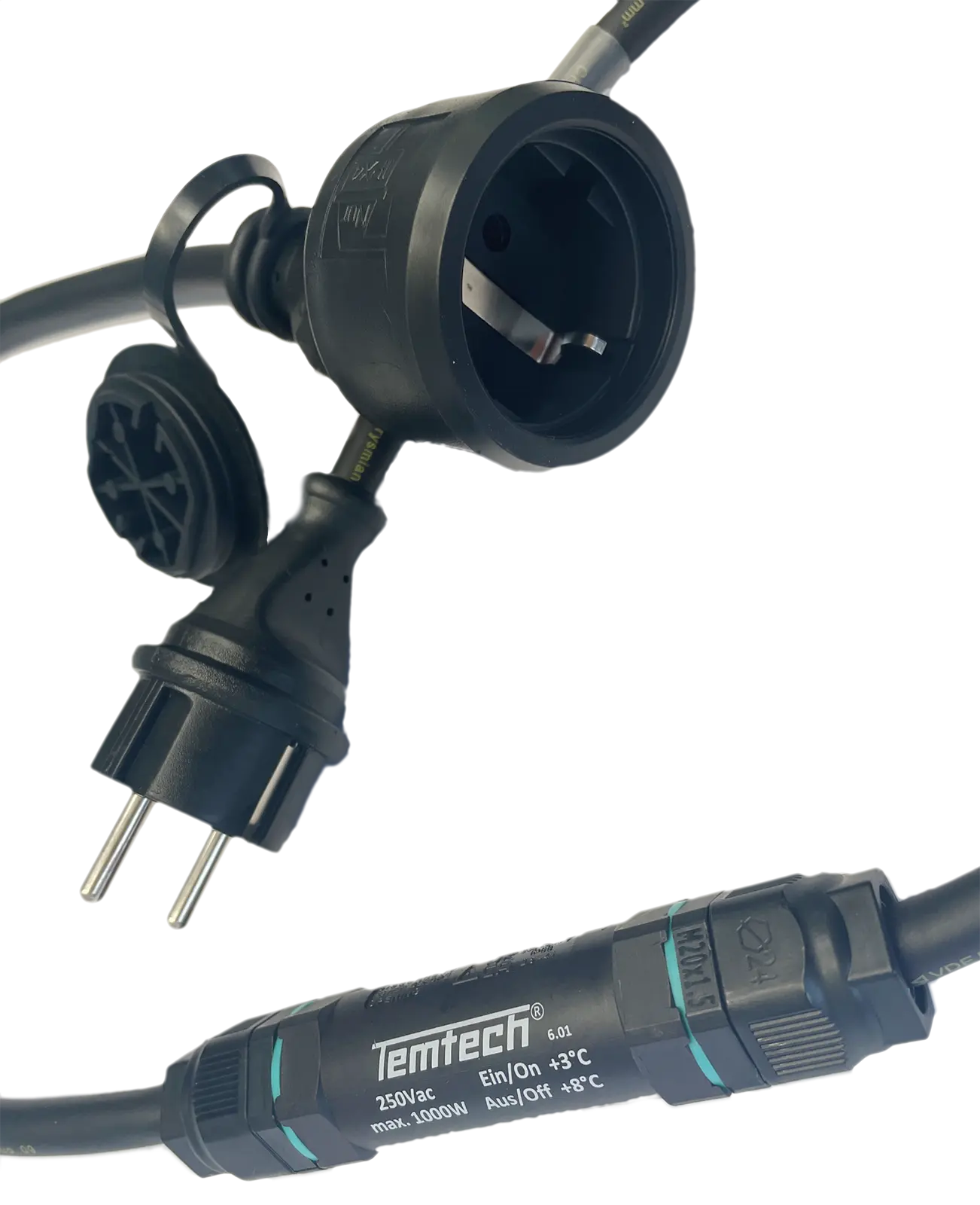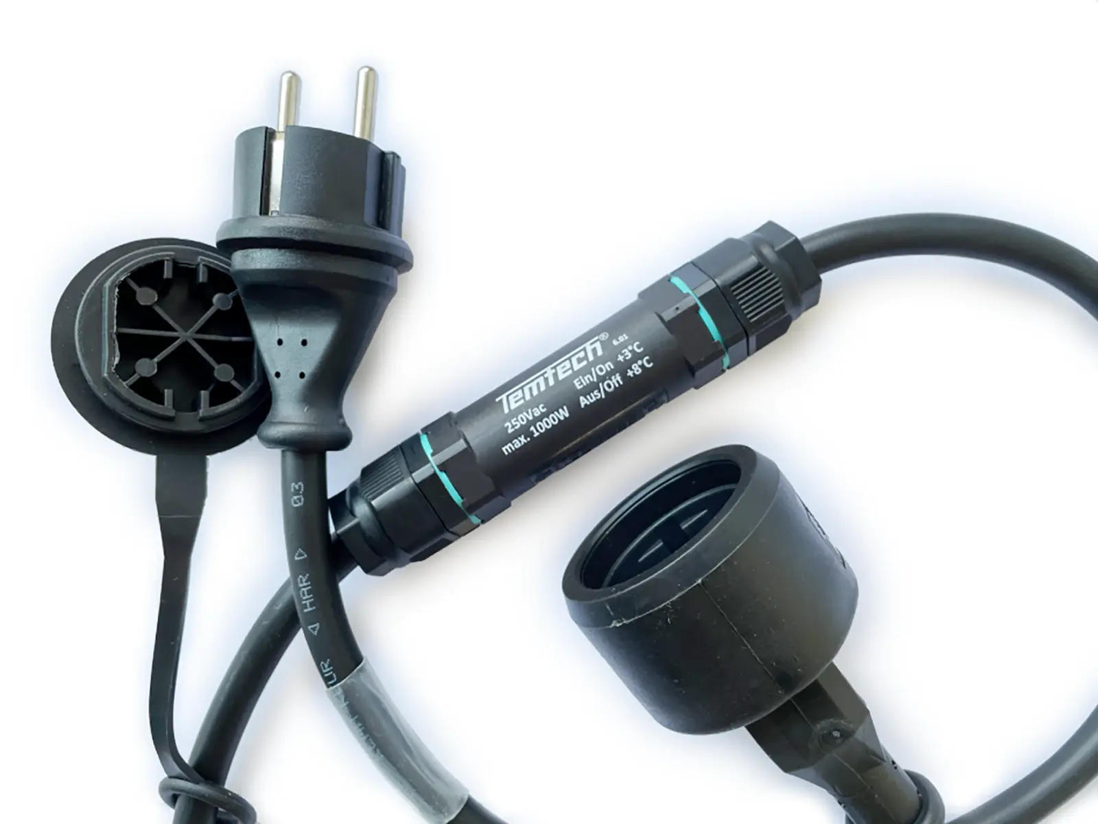 Frost monitor specially developed for use in harsh environments with splash-proof Schuko plug and coupling (IP44). The temperature range used closes the circuit with a single pole when temperatures fall to just above freezing point at approx. 3°C and opens when temperatures rise above 8°C. The cable has no power consumption!