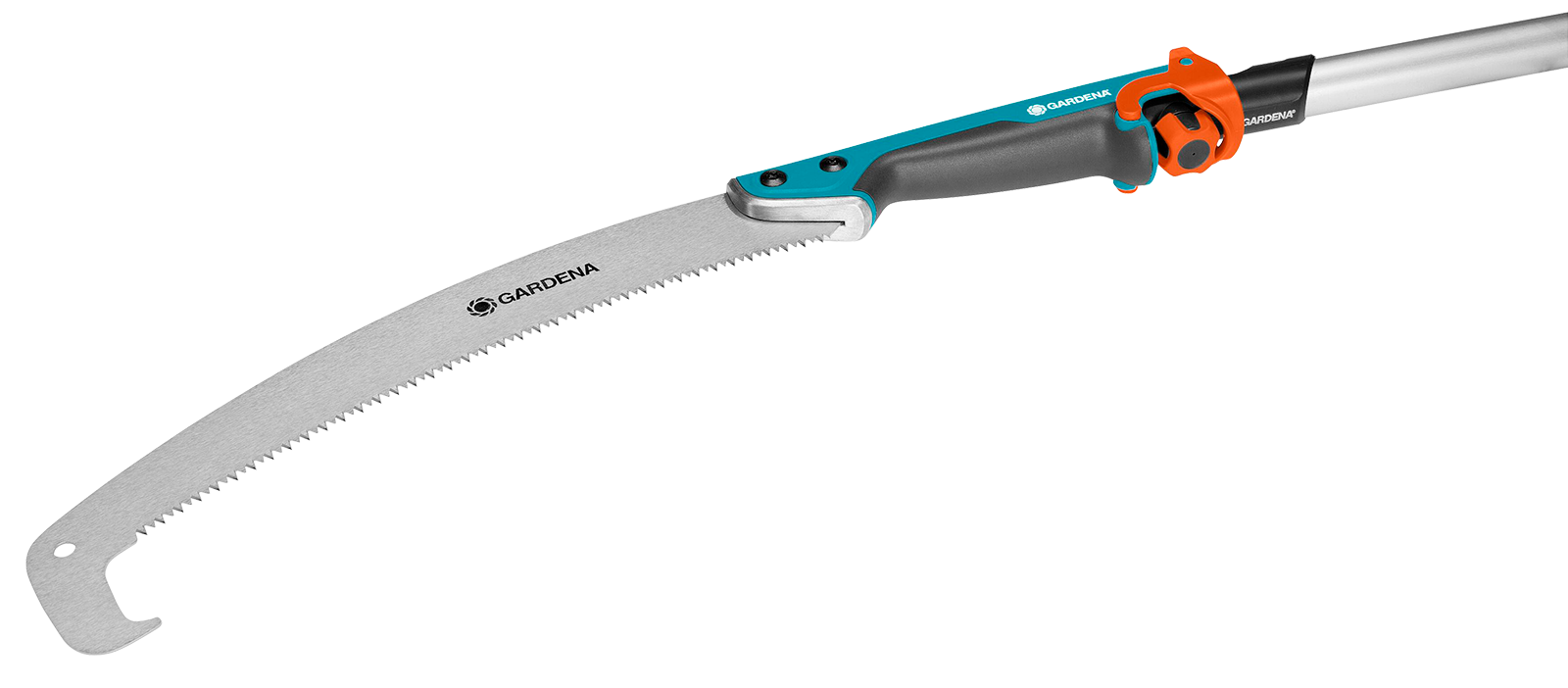Use the integrated clearing hook on the front part of the curved saw blade to easily pull out sawn branches. In addition, it protects you from slipping with the saw and makes sawing easier. ~