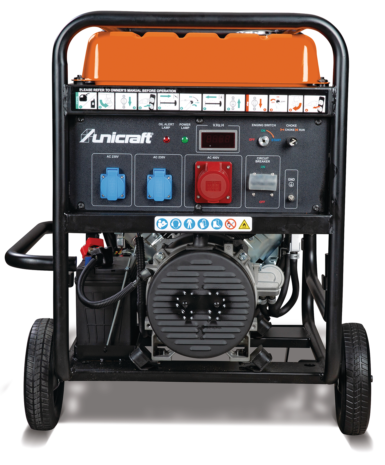 - Low oil shutdown with warning lamp3 in 1 display for voltage, frequency and operating hours
