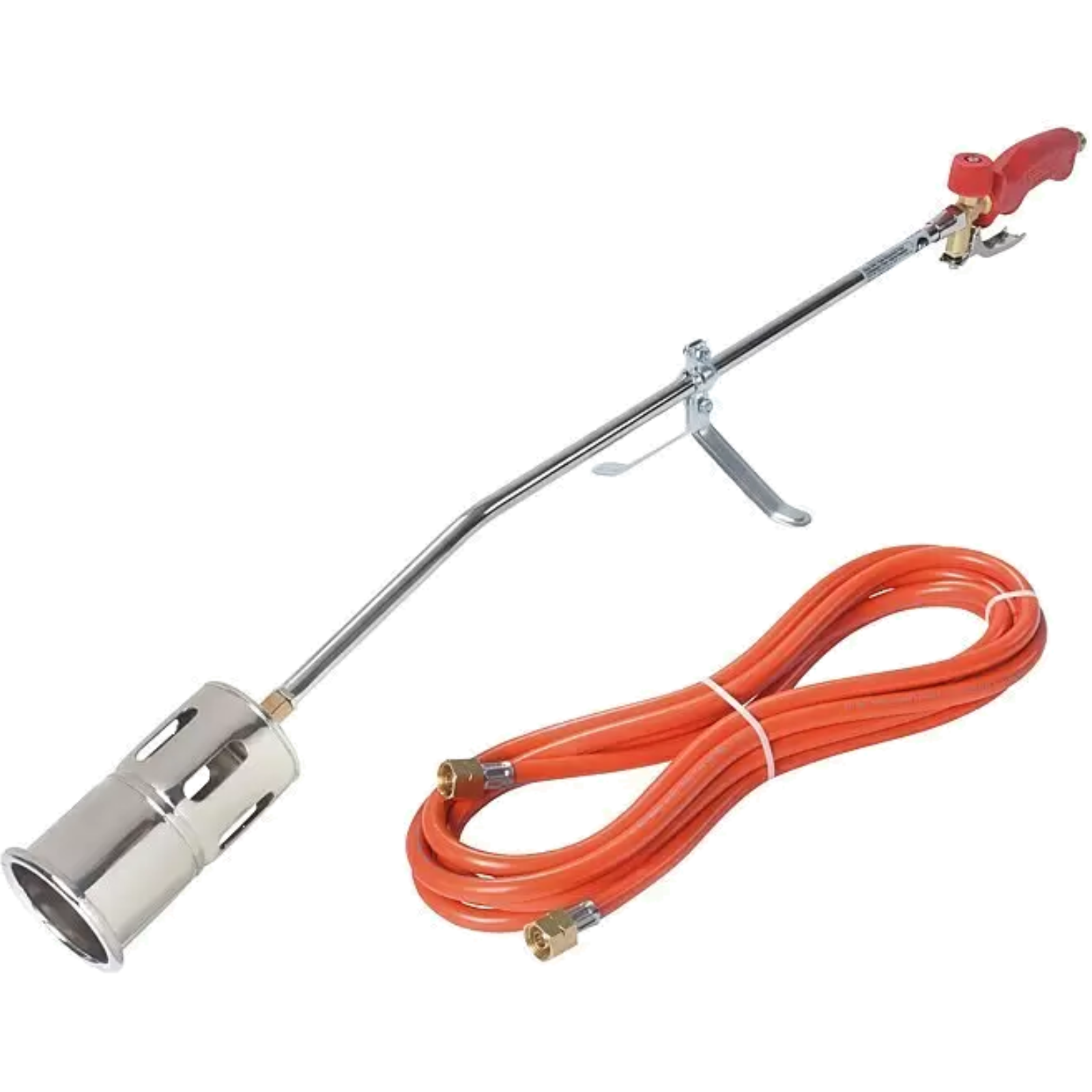 The set consists of a reinforced edge and surface-coated high-performance burner with flame stabilizer, an ergonomic safety handle with three-way valve and fixed pilot flame, a burner tube bent at approx. 35 with burner support and a propane gas hose.