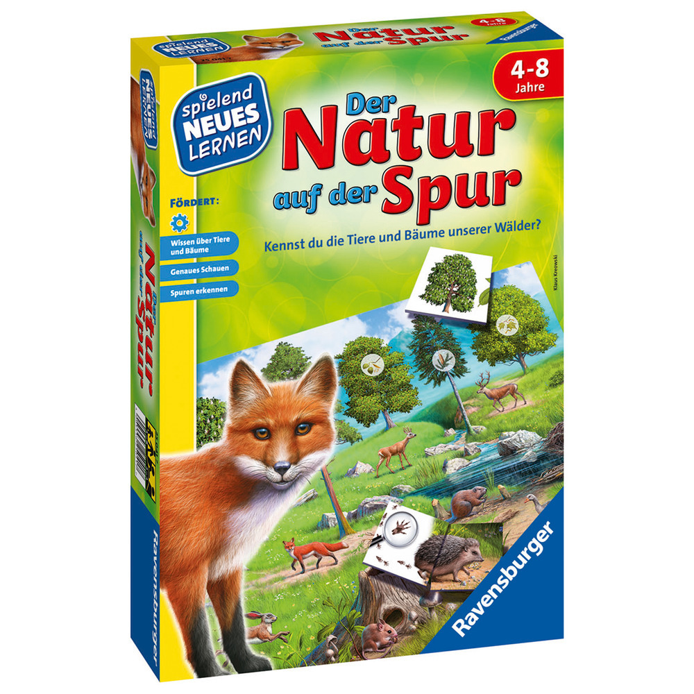 Do you know the animals and trees in our forests? This nature game promotes children's knowledge of the local flora and fauna. The exciting search for clues and the classification of trees, leaves and fruits brings a lot of fun to young explorers. Fox, deer and wood mouse invite you to an exciting search for clues in the forest. Which animal does this track belong to? The children also get to know typical trees with their leaves and fruits in this game. Funding focus: knowledge about local animals and trees, looking closely, recognizing tracks Contents: 1 game board made up of six parts, 28 animal cards, 18 tree cards, 4 garbage cards, 1 turntable.