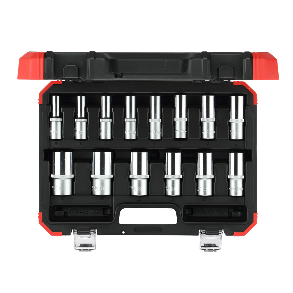 Carolus tool set with extra-long (75 mm) 1/2? sockets in sizes 10, 12, 13, 14, 15, 17, 19, 21, 22, 23, 24, 27, 30 and 32 mm. Ideal for screw connections that are difficult to access or for universal use.