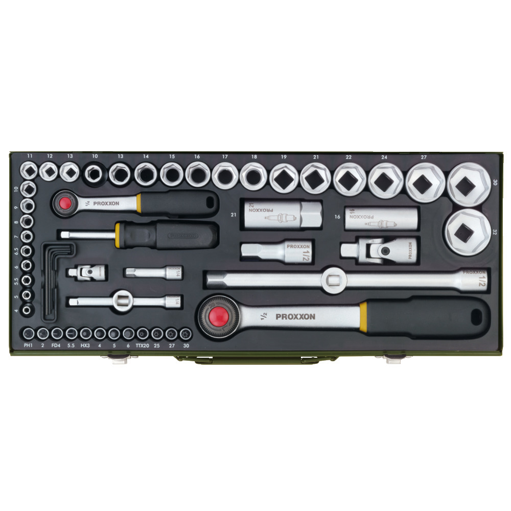 Drive 1/2? and 1/4?. Sockets 4-32 mm with extensive screw inserts (including Torx). In steel casket. Everything in high quality with a 2 year guarantee.