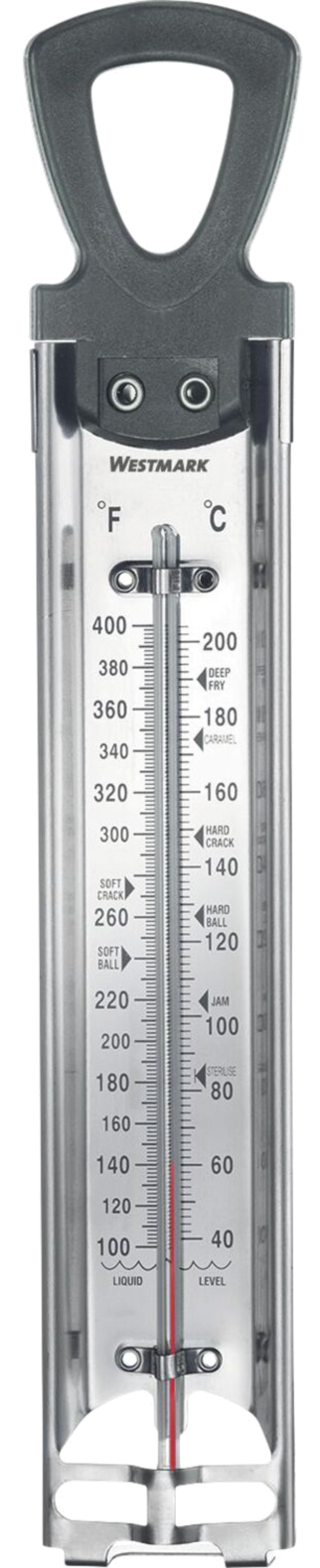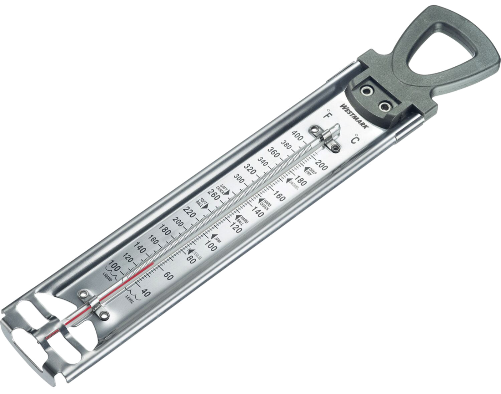 This sugar thermometer measures temperatures from 40 to 200 °C and is ideal for sugar work, jam, or syrup.
