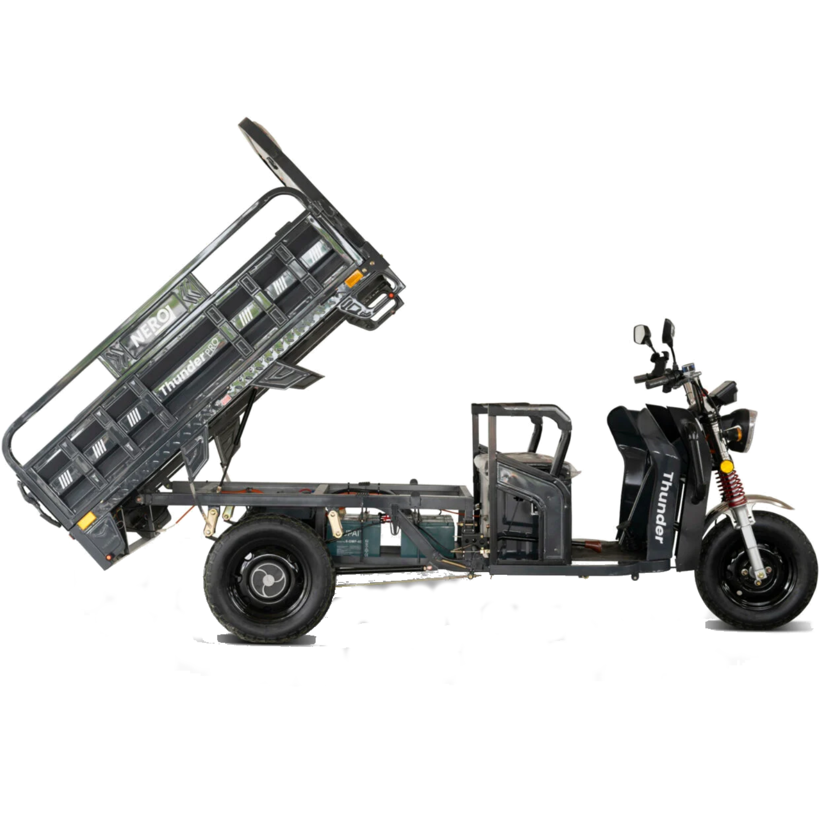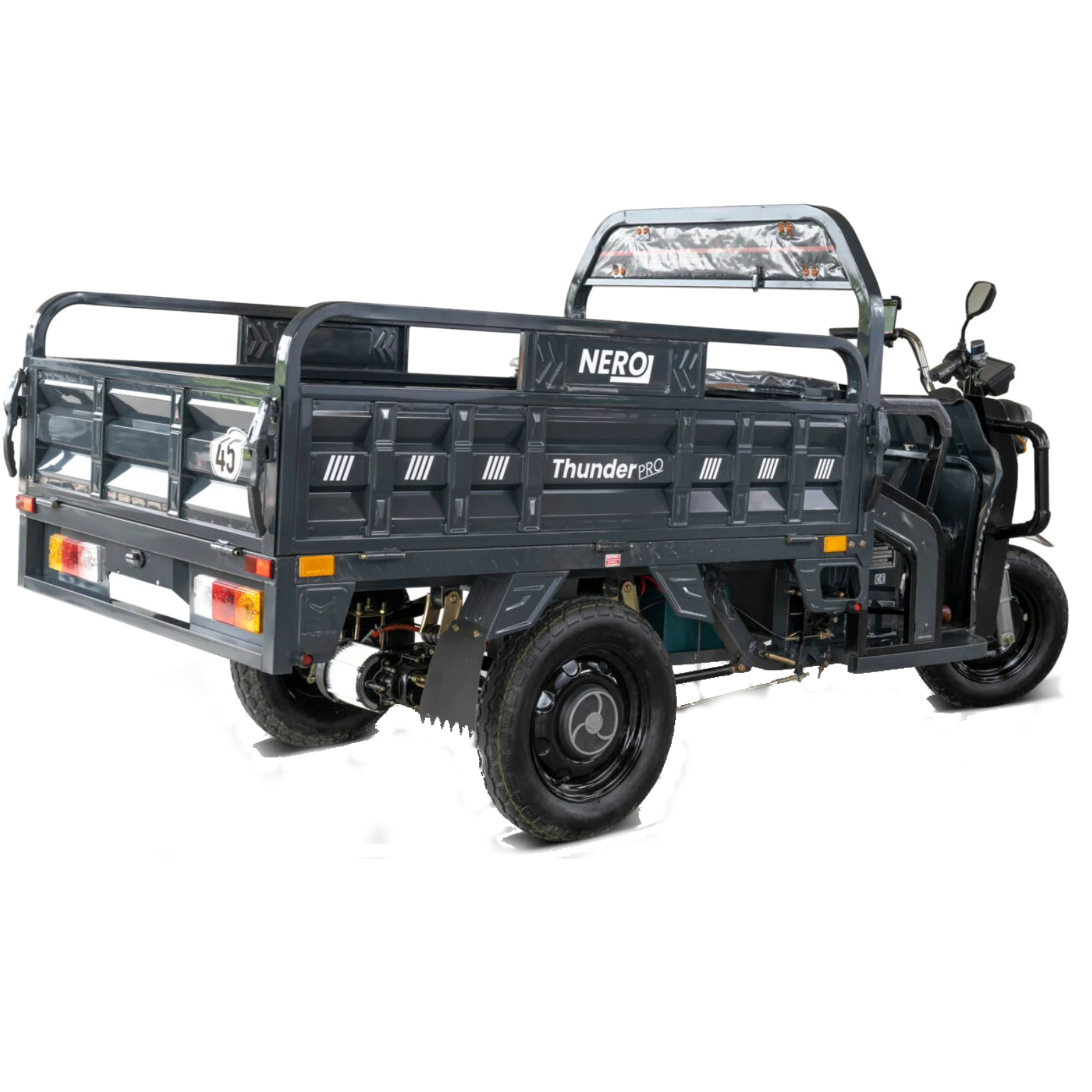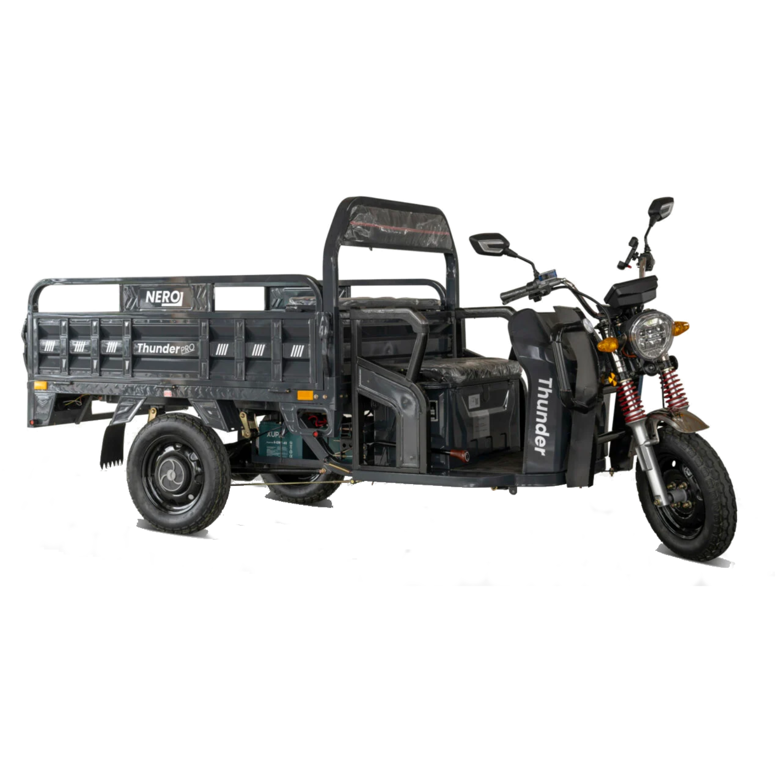 The NERO Thunder PRO electric cargo tricycle impresses with numerous practical features. There is generous storage space under the driver's seat, ideal for safely storing personal items, even in rainy weather. This environmentally friendly electric cargo tricycle also has a CE certificate and requires virtually no maintenance, making maintenance costs extremely low.