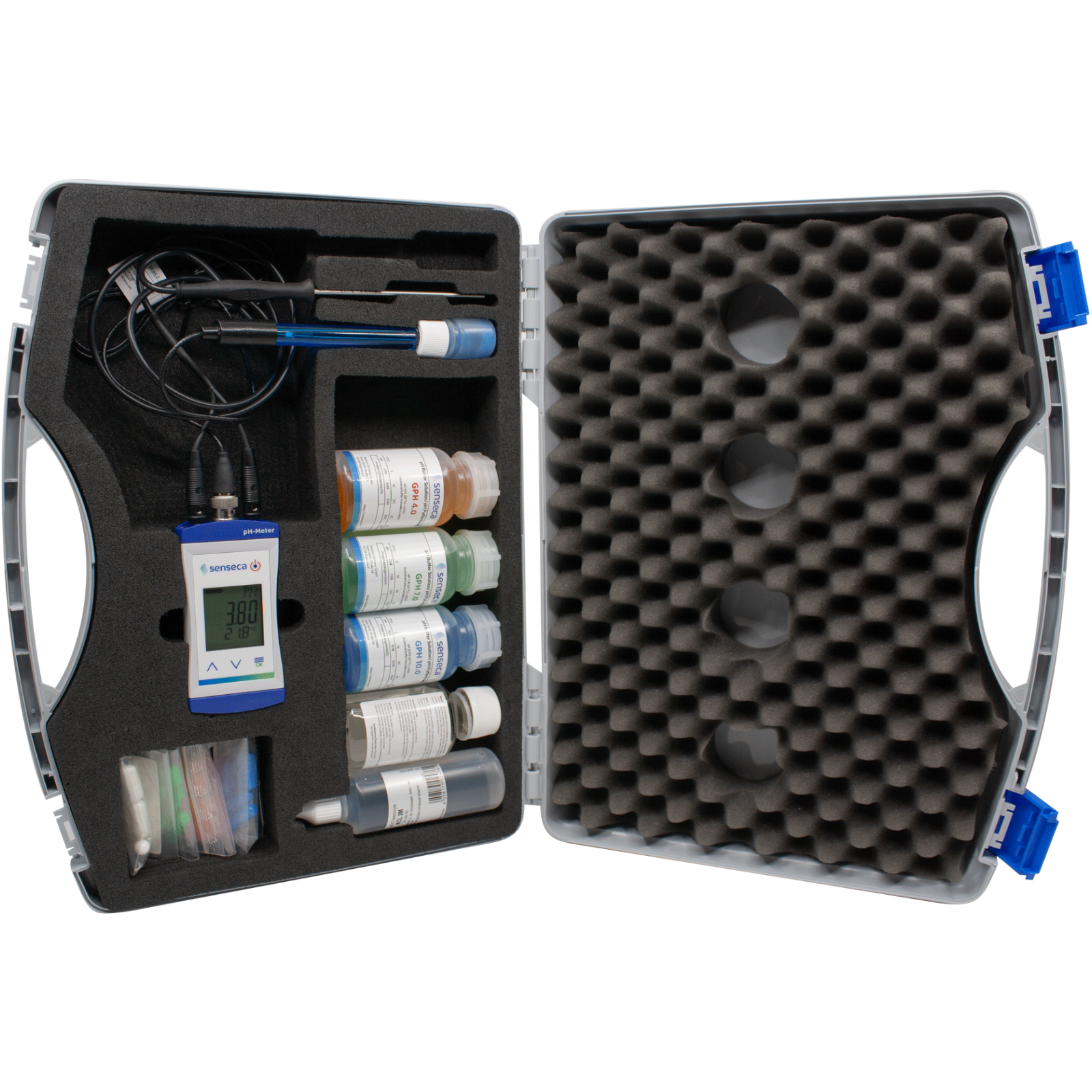 Measuring device in protective case, test report, batteries, operating instructions, pH electrode GE 114-WD, starter set