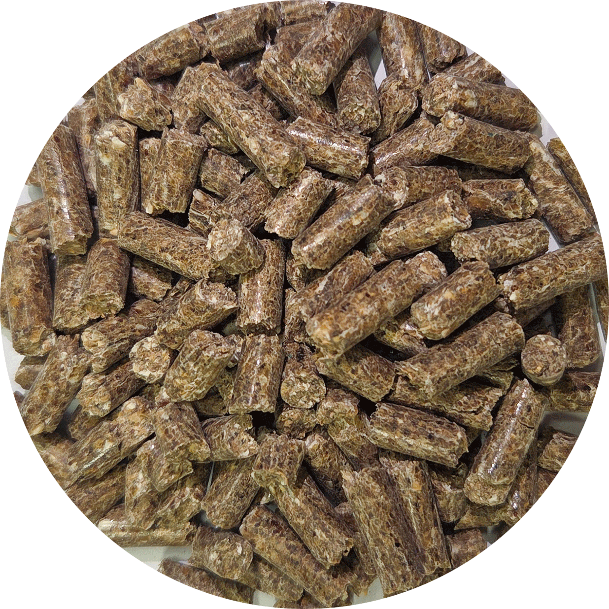 Orge, son de blé, farine d'herbe verte, tourteau de soja, marc de pomme, graines de lin, tourteau de tournesol, carbonate de calcium, mélasse de betterave, huile végétale, levure de bière, lactosérum en poudre, chlorure de sodium, magnésium