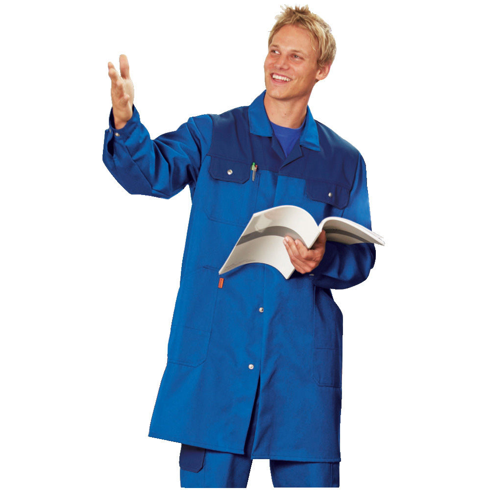 Modischer Arbeitsmantel aus hochwertigen 300 g Mischgewebe (65% Poly / 35% Baumwolle).2 Brusttaschen mit Patte und Bleistiftfach. Je 1 innen und 2 Seitentaschen sowie 1 Handy- und 1 Ärmeltasche. Frontverschluss mit verdeckten Swip-Drücken.Größe 46-58.