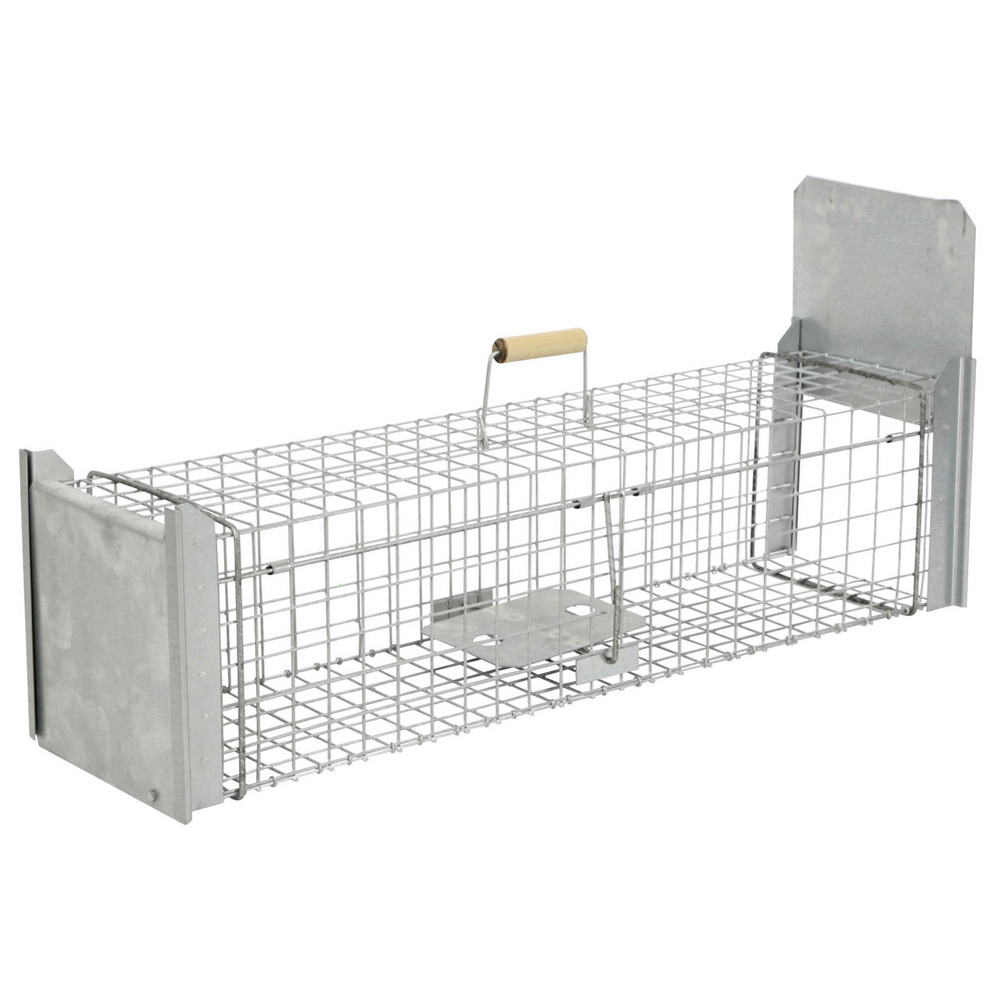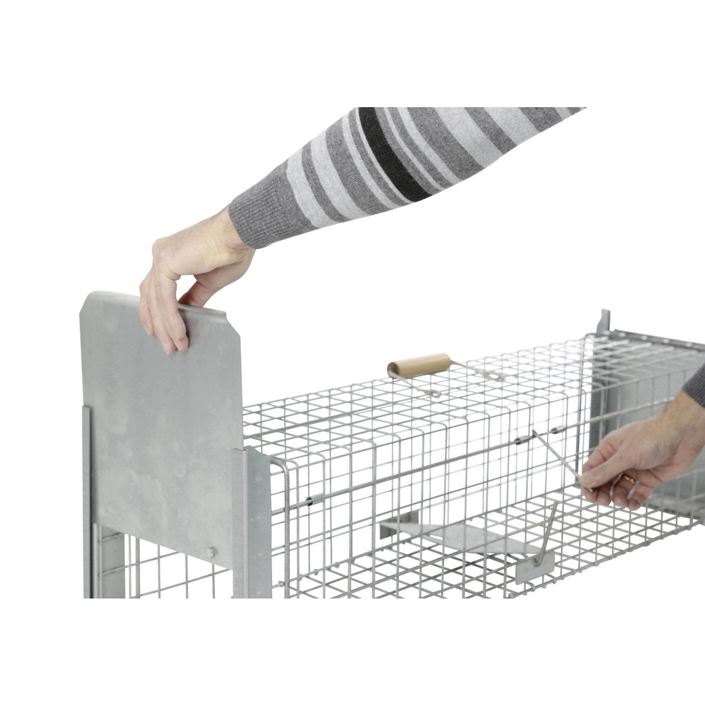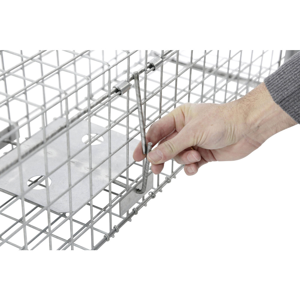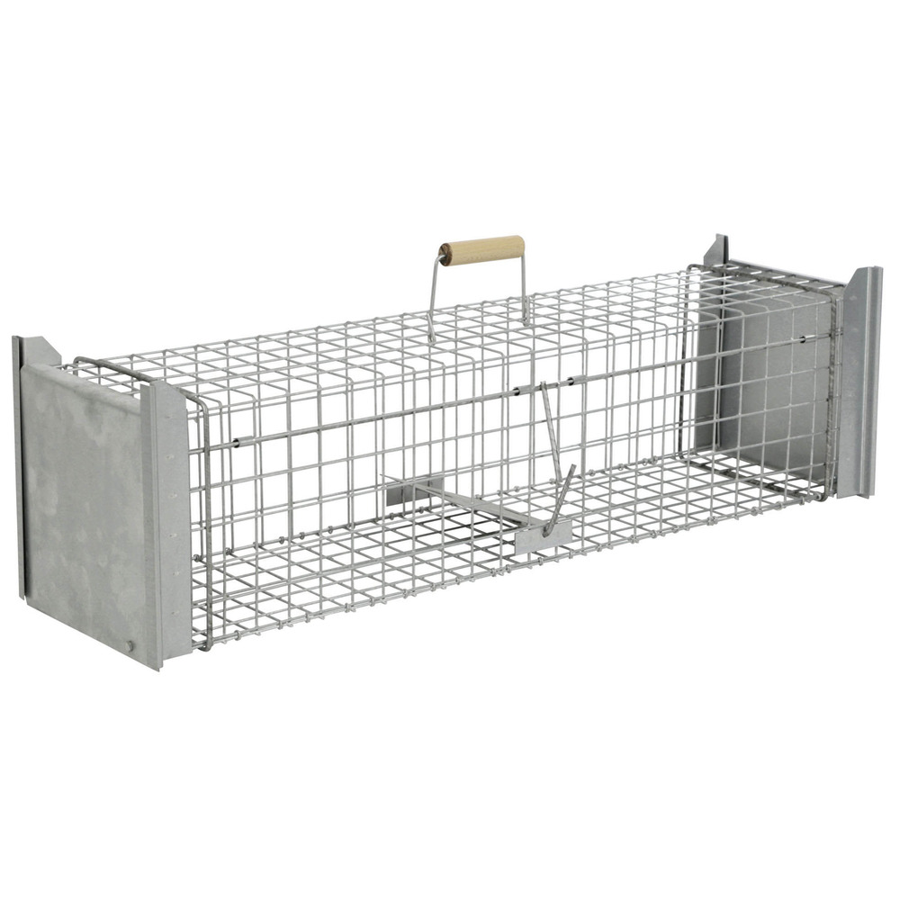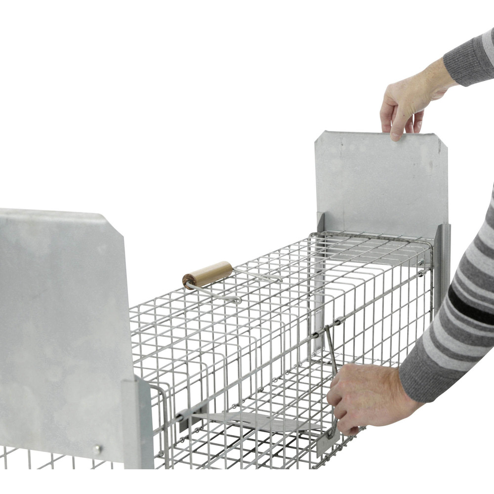 Piège vivant avec bouton-pression ou trappe des deux côtés, idéal pour attraper en toute sécurité et dans le respect des animaux, par ex. B. Renards, chats errants, ratons laveurs, martres et autres animaux. Le grillage métallique robuste vous offre une vue directe sur votre piège à animaux sans vous mettre en danger, ni mettre en danger l'animal capturé. Protégez votre maison et votre jardin – dans le respect des animaux ! Piège ou porte à pression à fermeture extrêmement rapide et anti-évasion avec cadre renforcé, inoffensif pour l'homme, durable grâce au treillis galvanisé à chaud avec fil super résistant de 3,3 mm, poignée en bois pour un transport en toute sécurité, préparation et fixation faciles de l'appât grâce aux accessoires utiles (pince métallique, porte-œufs, brochette à viande), extrêmement stables et durables, pré-assemblés et prêts à être utilisés immédiatement. Épaisseur du fil : 3,3 mm ; Treillis métallique : 38 x 38 mm ; Poids : 6,2kg L x l x H : 105 x 26 x 26 cm.