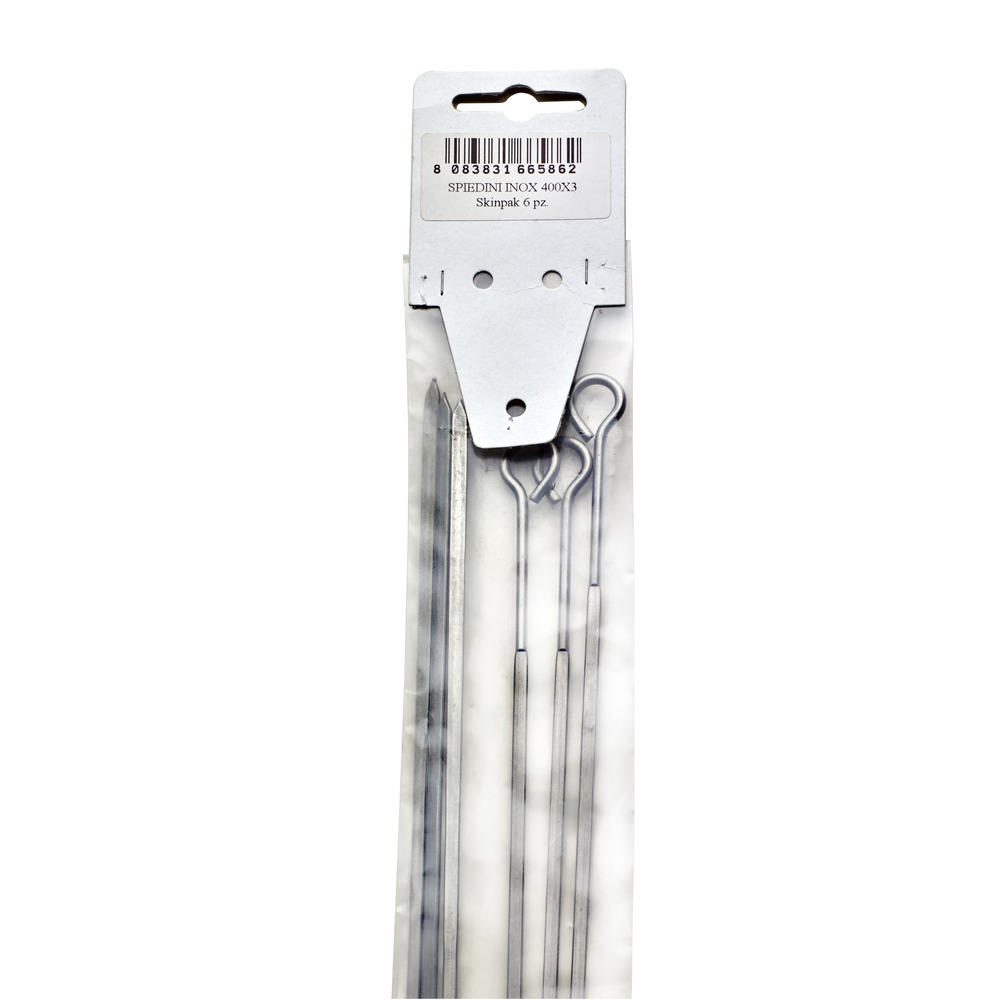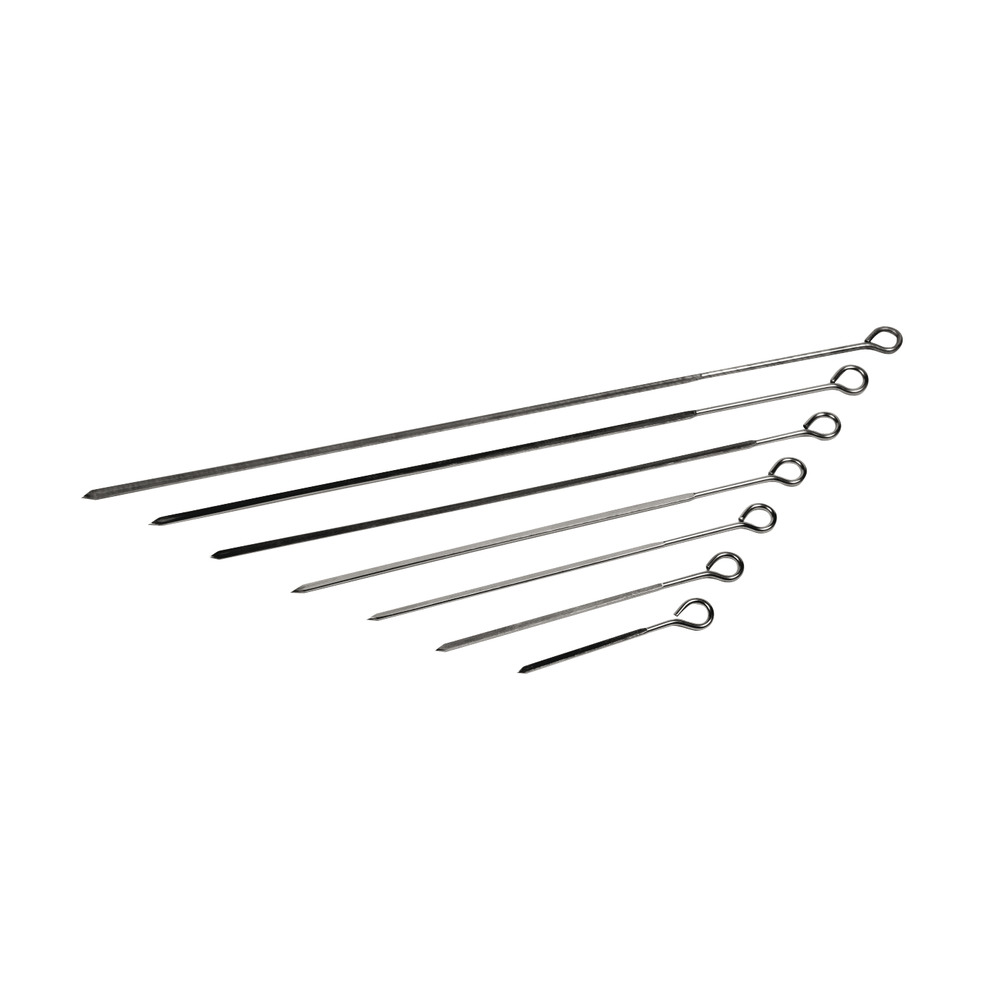 Brochette plate en acier inoxydable avec boucle de poignée. Idéal pour griller et rôtir la viande et les légumes ainsi que le chachlik. Paquet = 6 pièces