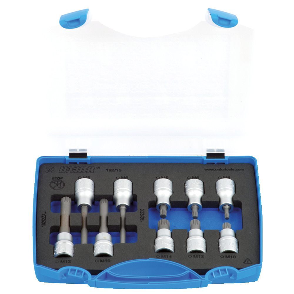 Cassette 1/2″ de 10 pièces avec chacune 1 insert multi-dents M 5,6,8,10,12 et 14 court et M 6,8,10 et 12 long. En cassette en tôle d'acier.