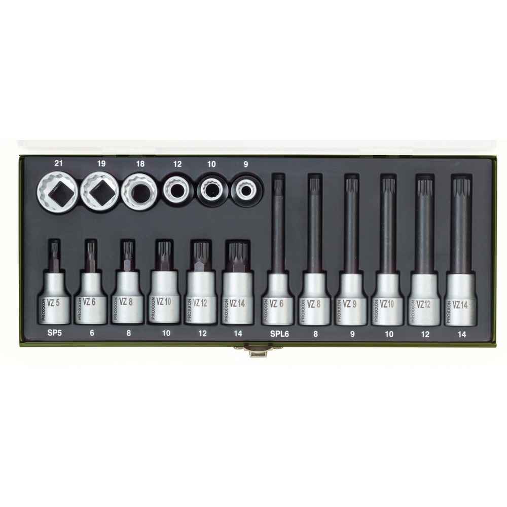 Jeu d'outils de haute qualité avec douilles multi-dents spéciales avec 1/2" Conduire. Fréquemment utilisé dans le secteur automobile, par exemple les moteurs, les arbres à cardan, les essieux, etc. Contenu : douilles 5-14 mm en versions normale (50 mm) et longue (100 mm), plus douilles internes 9 - 21 mm.