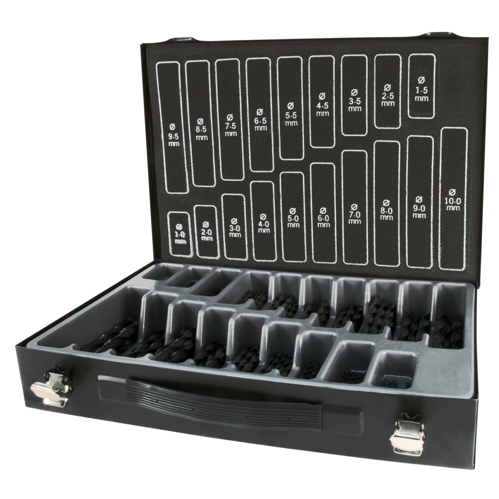 Forets hélicoïdaux HSS 4241 laminés dans une cassette métallique pratique. Contenu : 10 pièces de 1/1,5/2/2,5/3/3,5/4/4,5/5/5,5/6/6,5/7/7,5 et 8 mm. 5 pièces chacune 8,5 / 9 / 9,5 et 10 mm.