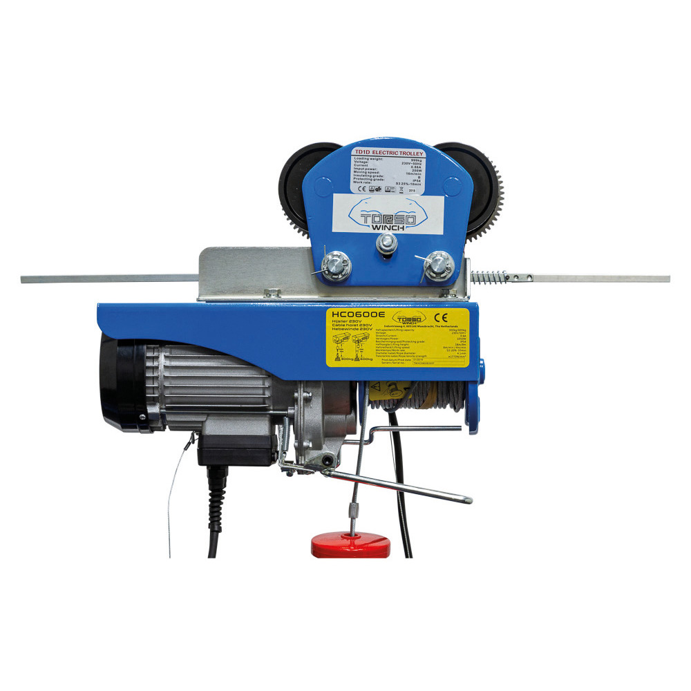 Chariot électrique, adapté à de nombreux palans électriques à câble, adapté aux poutres en H et en I, plage de réglage 68-110 mm. Avec plaques universelles pour fixer divers appareils de levage. Y compris des entretoises pour éviter de heurter le mur. Capacité de charge jusqu'à 1 000 kg, puissance 200 W, vitesse 16 m/min, longueur du câble de connexion 550 mm, longueur du câble de commande 1500 mm.