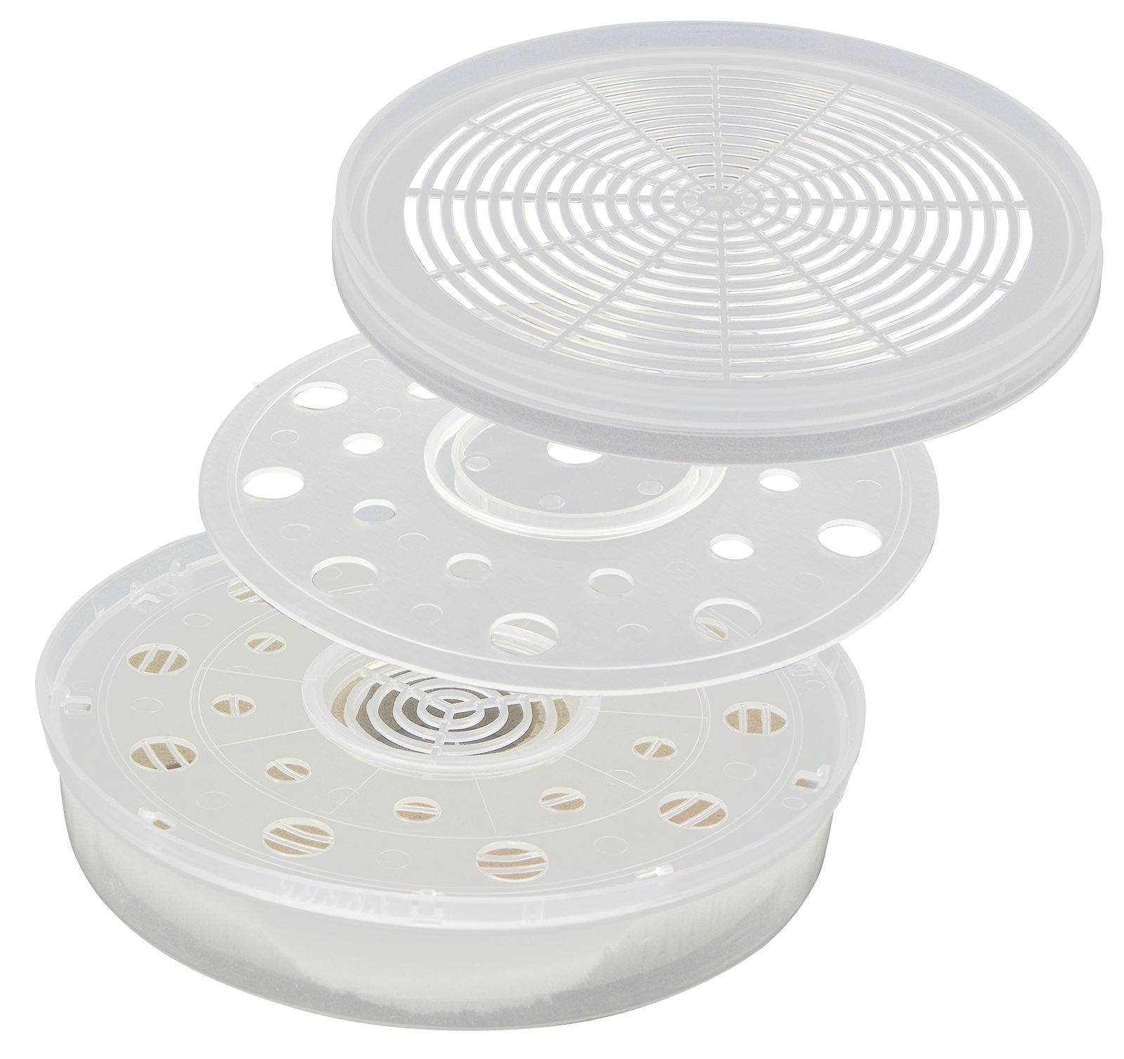 Evaporateur d'acide formique plat et rond pour le traitement de la varroase dans les colonies d'abeilles.Convient à tous les types de ruches. Traitement possible en haut ou en bas de la tour de cadres. Remplissage simple et sûr, de préférence à l'aide d'une seringue de dosage, ne retirer le couvercle que sur la ruche. Dose d'évaporation réglable en fonction de la force de la colonie et de la température grâce à deux plaques perforées à rotation inverse.