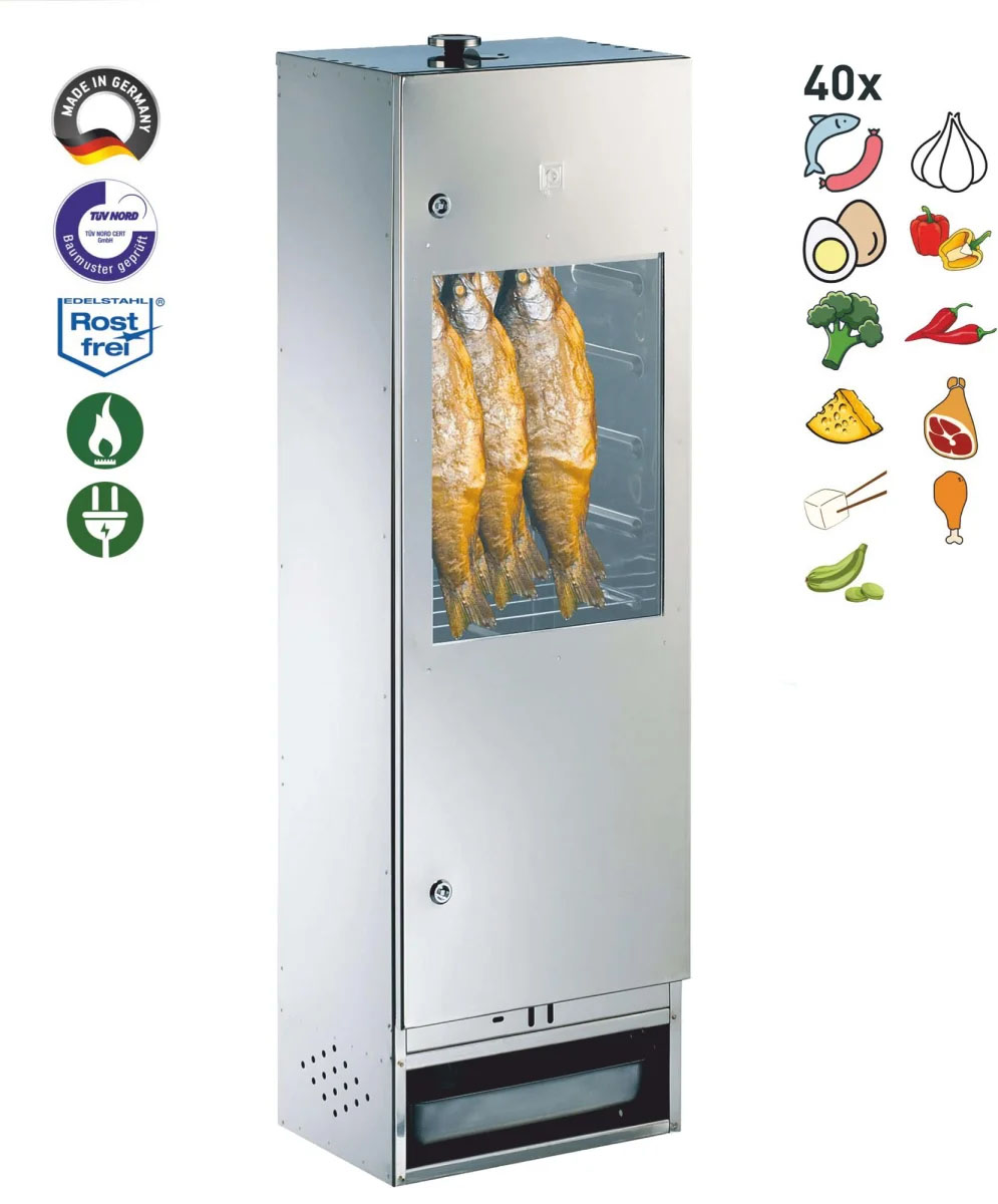 Informations sur le produit "Fumoir en acier inoxydable avec porte pour environ 40 poissons, avec fenêtre"