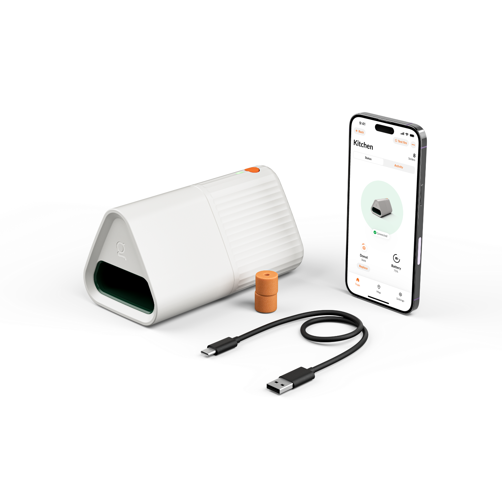 Der Vorgang erfolgt automatisch und wird nach jeder Aufnahme neu initialisiert. Der Donut macht das Gerät unwiderstehlich und die Batterie sorgt dafür, dass das Gerät mehrere Monate lang funktioniert. Darüber hinaus müssen Sie die Transporttasche nicht sehen oder berühren, da dies eine besonders einfache und technische Verwendung erfordert.