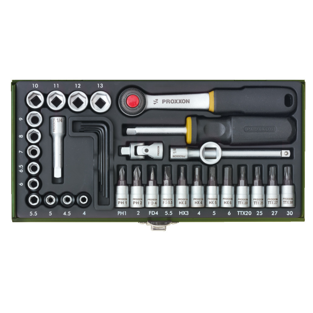 Jeu de mécanique de précision de 36 pièces, douilles 4-13 mm, embouts de tournevis, etc. Idéal pour la maison, les loisirs et l'atelier. Dans un coffret en acier.