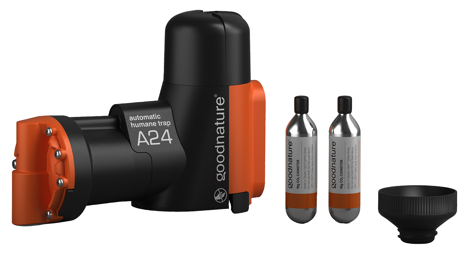 Der digitale Zähler registriert, wie häufig die Falle ausgelöst wurde. Wenn der Zähler auf 24 steht, muss die CO2-Patrone ausgetauscht werden. Der kompakte und intelligente Zähler kann einfach auf die CO2-Patrone der A24 Falle aufgeschoben werden.