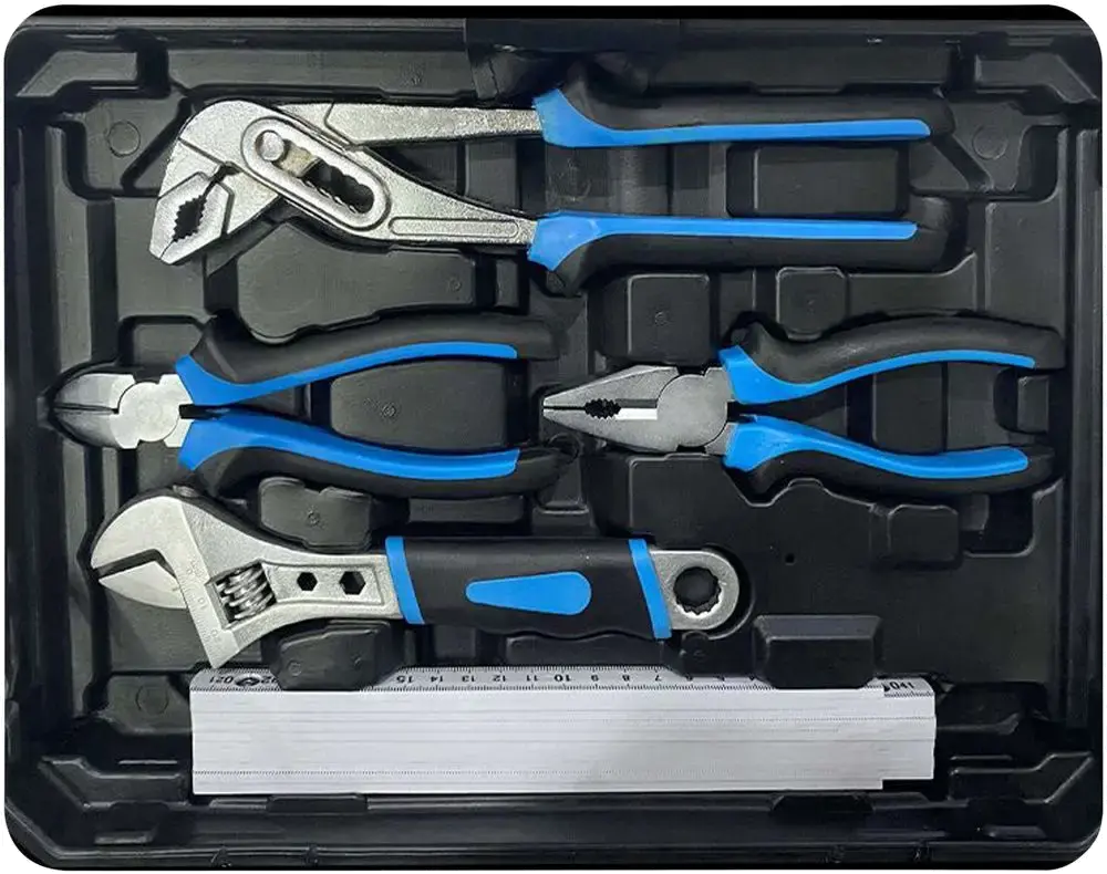 Ce set d'outils de 241 pièces en acier au chrome-vanadium et au carbone va de l'assortiment classique de tournevis à la scie, en passant par une clé à cliquet avec diverses clés à douille, plusieurs pinces et clés mixtes à fourche et un grand assortiment d'embouts, y compris des embouts longs.
