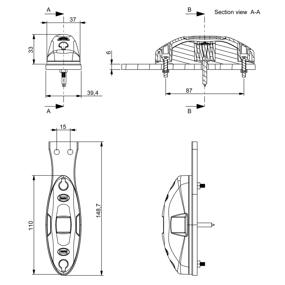 10-30V, feu arrière/feu de position, feu de position latéral, rouge/blanc jaune Support droit, câble 1000mm, ECE Dimensions LxHxP : 39x148x40mm