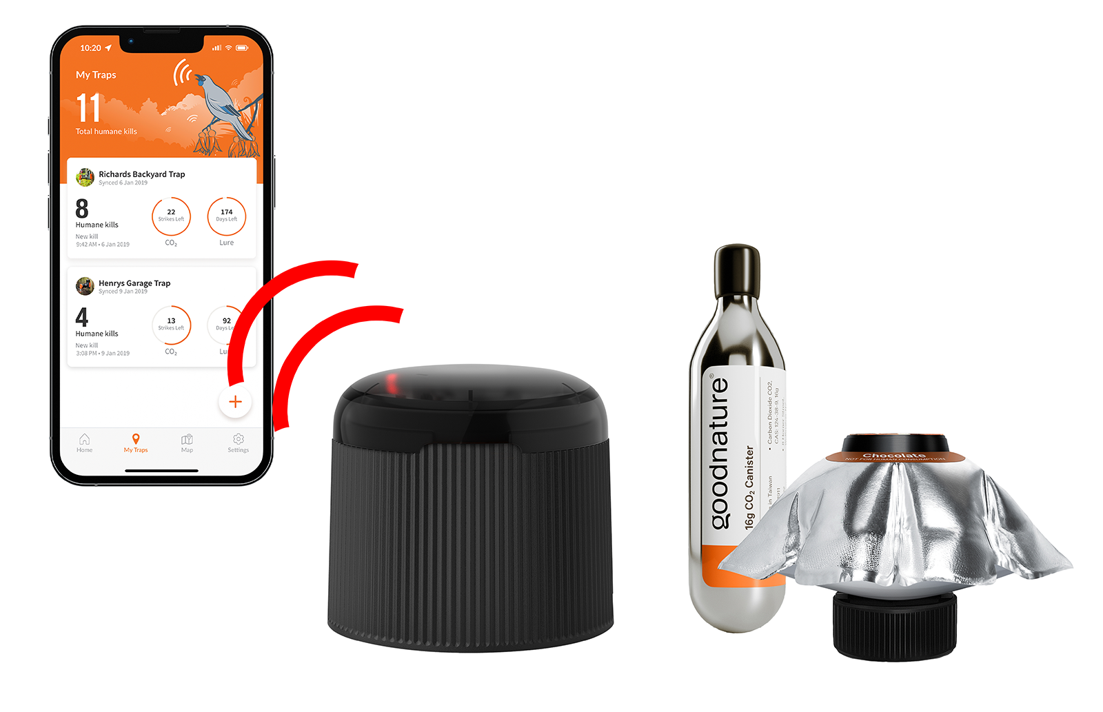 Goodnature Smart Cap + A24"Le Goodnature A24 est un piège sans poison qui combat les rats et les souris rapidement et sans douleur. Le Smart Cap connecte le piège à votre smartphone via Bluetooth. Le Pest n'est pas attrapé une fois déclenché. Cela permet à la nature de suivre son cours et le rat ou la souris tué peut servir de nourriture à d'autres animaux sauvages. Lorsque le piège est déclenché, il se réinitialise automatiquement avec une cartouche de Co2 qui dure 24 frappes. Dans le logiciel gratuit Goodnature vous pouvez voir combien de fois, quand et quel piège a été déclenché. Vous pouvez également recevoir une notification à chaque fois que vous l'attrapez et voir quand vous devez remplacer la cartouche de Co2 et l'appât. Pour que votre piège soit le meilleur possible. efficace, vous devez exclure autant que possible les autres sources de nourriture dans la zone et travailler avec des gants. Ce piège est également livré avec trois cartes de détection avec appât. Vous pouvez les placer là où vous pensez que le piège sera le plus efficace. Placez ensuite le piège à l'endroit où la carte a été le plus rongée. Cet ensemble comprend également un appât de six mois, deux cartouches de Co2 pour 24 sorties chacune et un compteur numérique. Le piège peut être fixé à l'aide du support inclus. Vous préférez poser le piège au sol ? Commandez alors un support de passage supplémentaire. Contenu de la livraison : 1x piège à rats et souris A24, 1x support de piège avec support de piège, 2x capsules de CO₂, 1 x entonnoir à attractif, 1 x pompe à attractif, 1 x Smart Cap