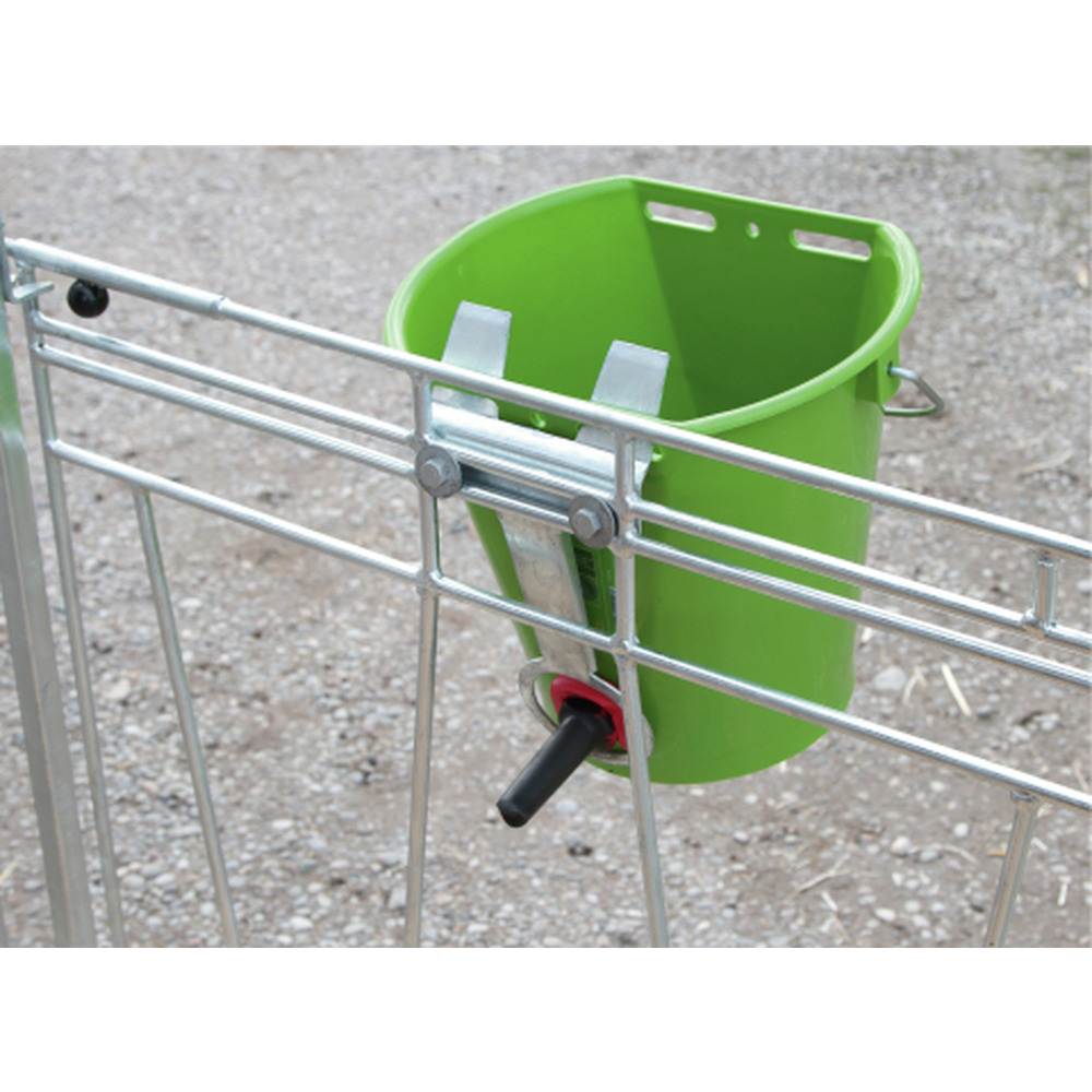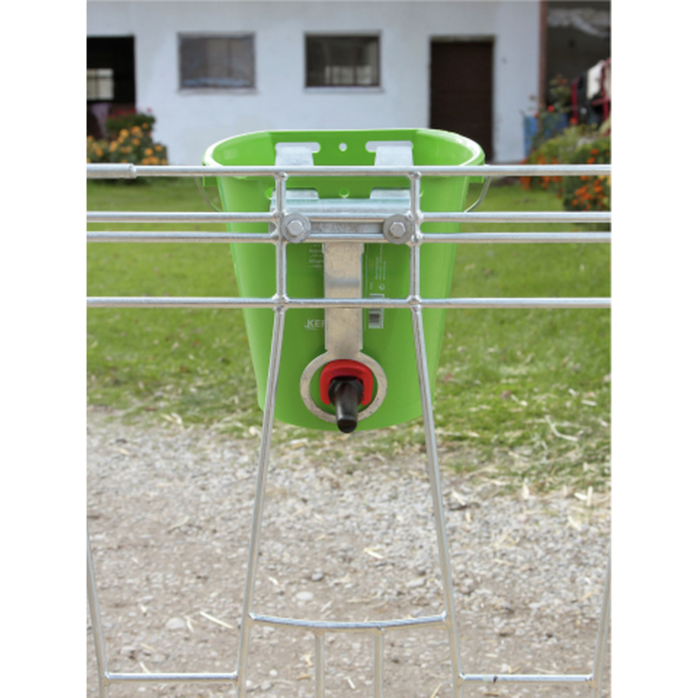 Convient à tous les seaux à boire. Grâce au verrou du seau, le seau reste en place lorsque vous buvez et ne peut pas être poussé vers l'arrière. Convient pour le montage sur les clôtures des clapiers à veaux. Galvanisé.