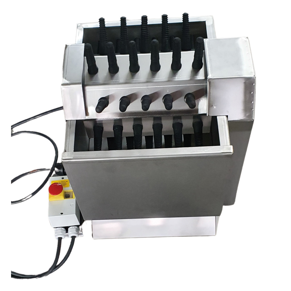 Conception : Acier inoxydable. Raccordement électrique 400V/0,37 kW, LxlxH : 45x45x50 cm, poids environ 30 kg, largeur du tambour : 28 cm, 48 doigts de plumaison. Aucun raccordement à l'eau requis !