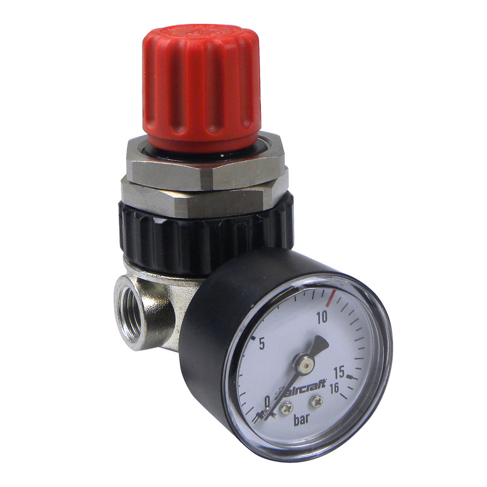 Avec 2x filetage intérieur ¼” et manomètre. Conception push-pull pour fixer la valeur définie. Pour l'installation de tuyaux, compresseurs, etc. Comprend un manomètre, affichage jusqu'à 16 bars, approuvé pour 12 bars.