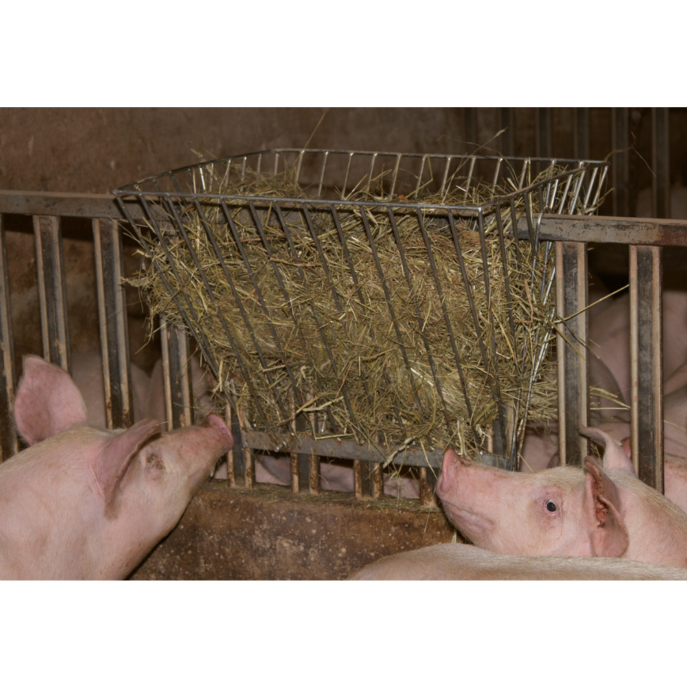 Élevez vos porcs de manière adaptée à leur espèce et réduisez la fréquence des morsures de queue et d'oreille en leur donnant du fourrage grossier ! Particulièrement adapté à l’administration de matières premières fibreuses dans les écuries porcines. Galvanisé, à fixer sur caisson ou paroi latérale jusqu'à une largeur maximale de 43 mm. Grâce à la faible largeur de 40 mm, seule une petite quantité de matériau est perdue et le risque de blocage dans le système de lisier est donc réduit. Épaisseur de la barre : 6 mm ; L x l x H : 62,5 x 51 x 48 cm.