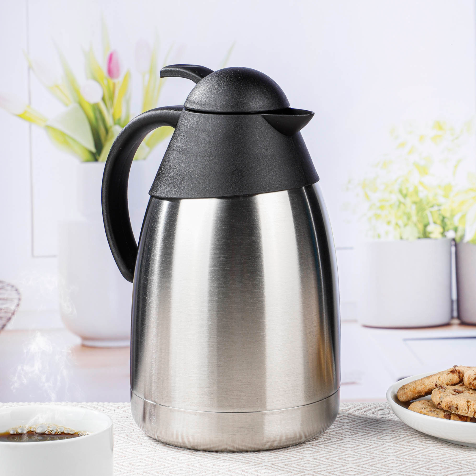 Die Thermoskanne mit Thermo Sicherheitsverschluss mit schwarzen Griff aus mattiertem Edelstahl ist der perfekte Begleiter für heiße oder kalte Getränke unterwegs.Dank der doppelwandigen Vakuumisolierung bleibt der Inhalt über Stunden hinweg auf der gewünschten Temperatur.Robuster Edelstahl sorgt dafür, dass die Kanne langlebig, geschmacksneutral und leicht zu reinigen ist.Ideal für Kaffee, Tee oder erfrischende Getränke – ob im Büro, beim Sport oder auf Reisen.Hält Getränke lange heiß oder kalt.