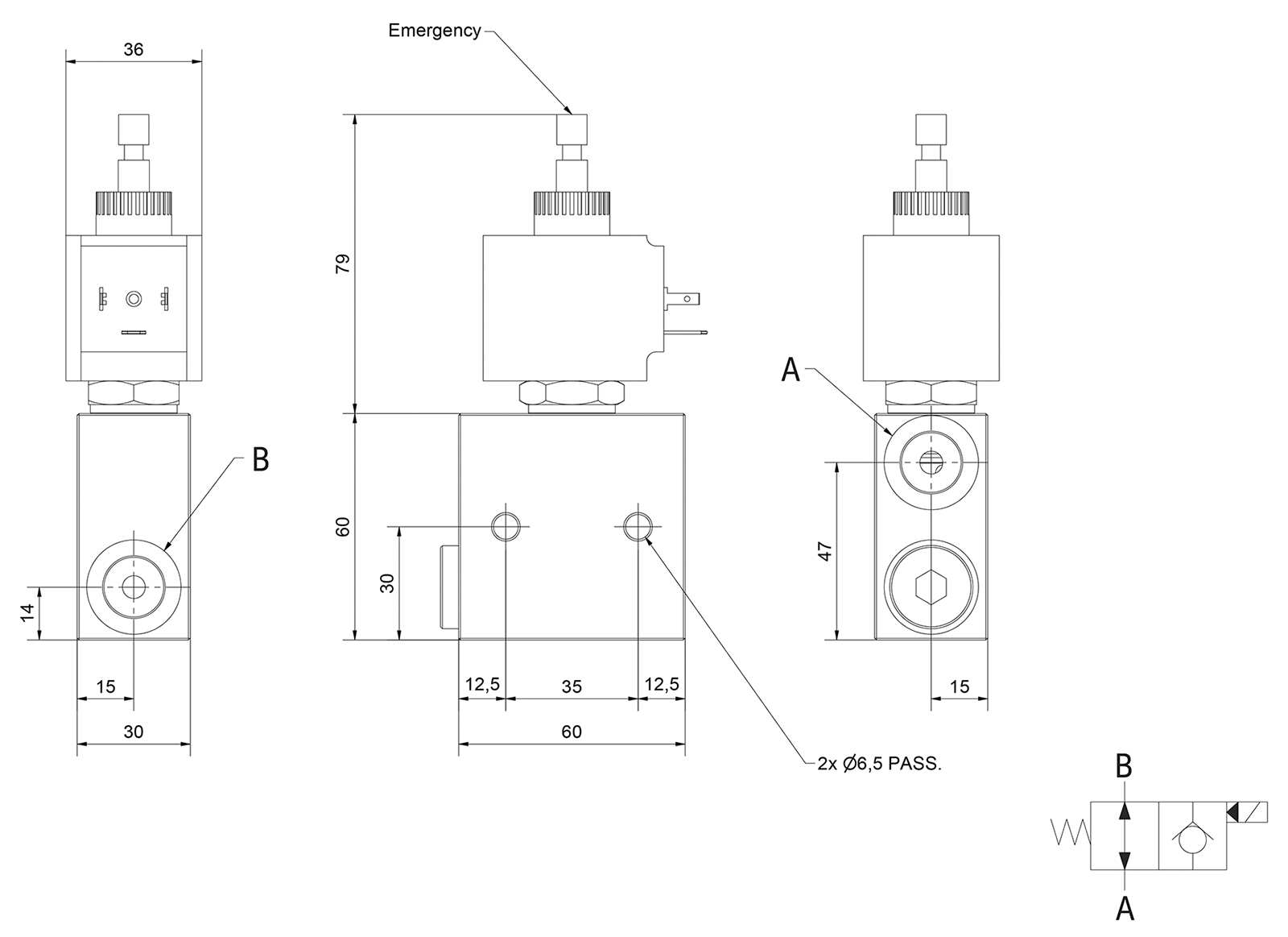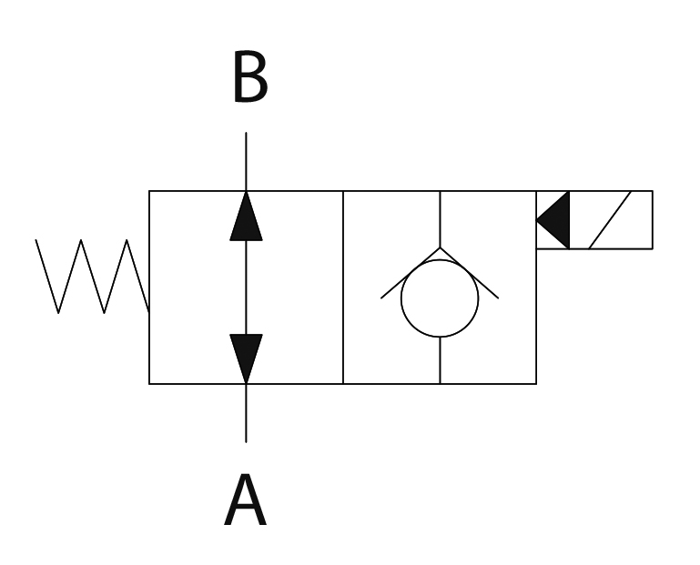Avec clapet anti-retour et vis de vidange d'urgence. Peut être utilisé comme robinet d'arrêt électromagnétique, comme ouvreur ou ferme-porte pour des commandes hydrauliques simples. Cycle de service 100%.