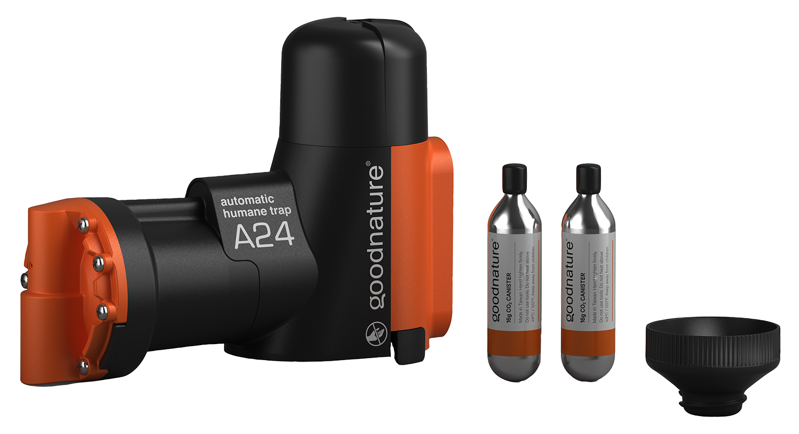 La trappola Goodnature Starter Kit Trap A24 è una trappola senza veleno che controlla ratti e topi in modo rapido e indolore. Dopo l'attivazione, l'infestante cade e la trappola è automaticamente pronta per 24 trappole. Questo consente di catturare più ratti o topi senza dover reimpostare la trappola. Se la trappola viene installata all'aperto, la carcassa può essere consumata in sicurezza da un altro animale (selvatico). Contenuto della confezione: 1 trappola per ratti e topi A24, 2 bombolette di CO₂, 1 supporto per trappola con viti, 1 imbuto attrattivo.
